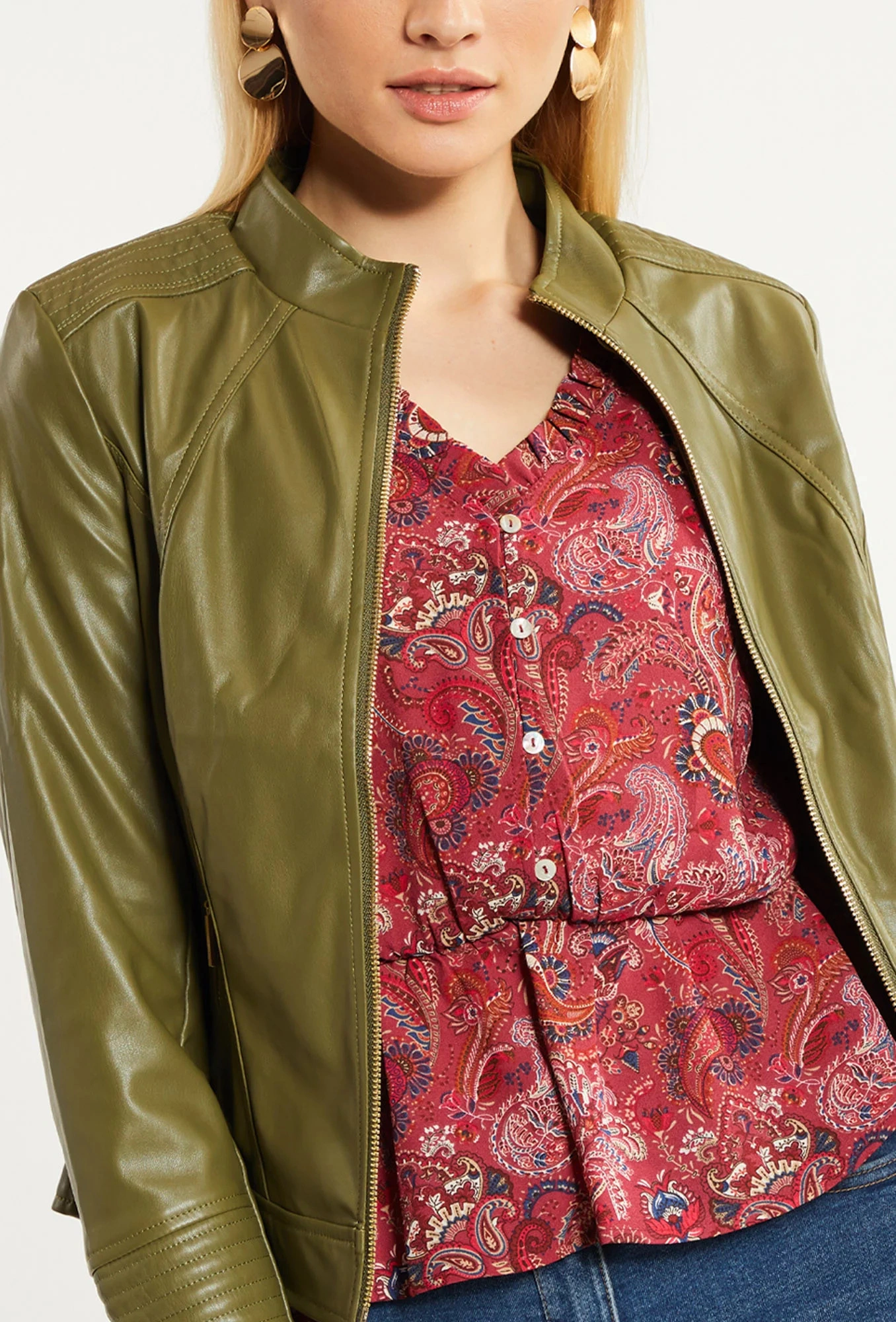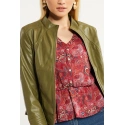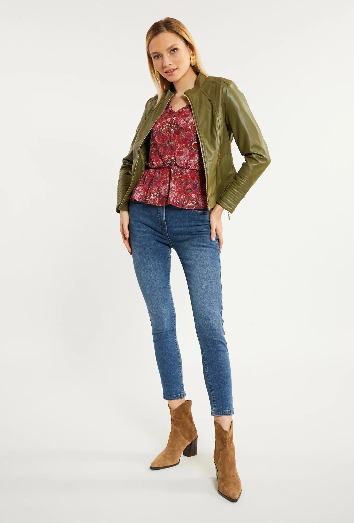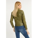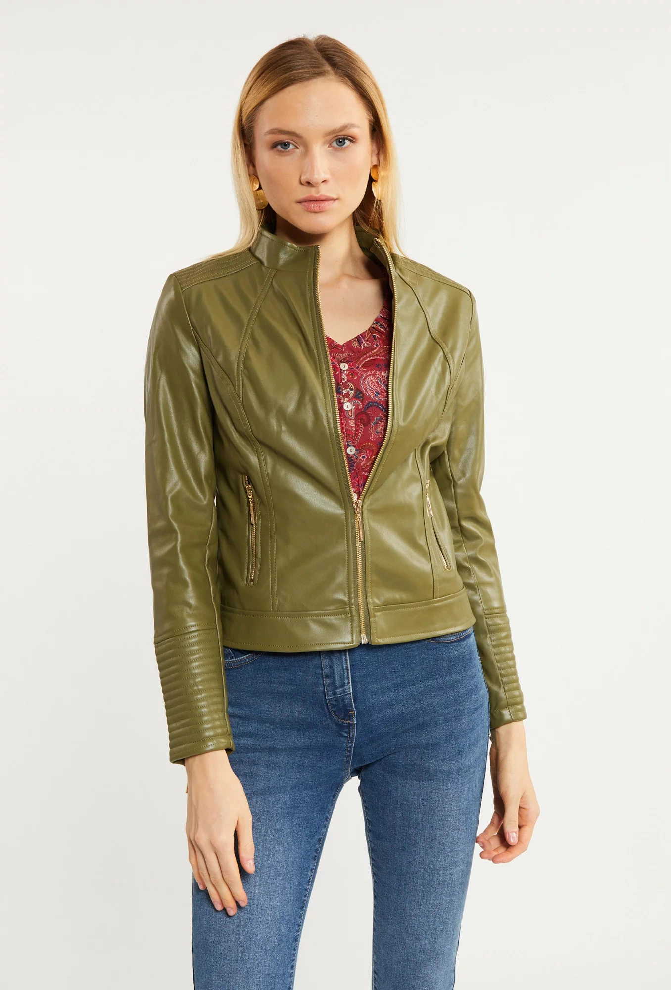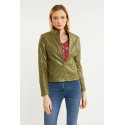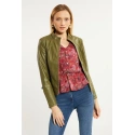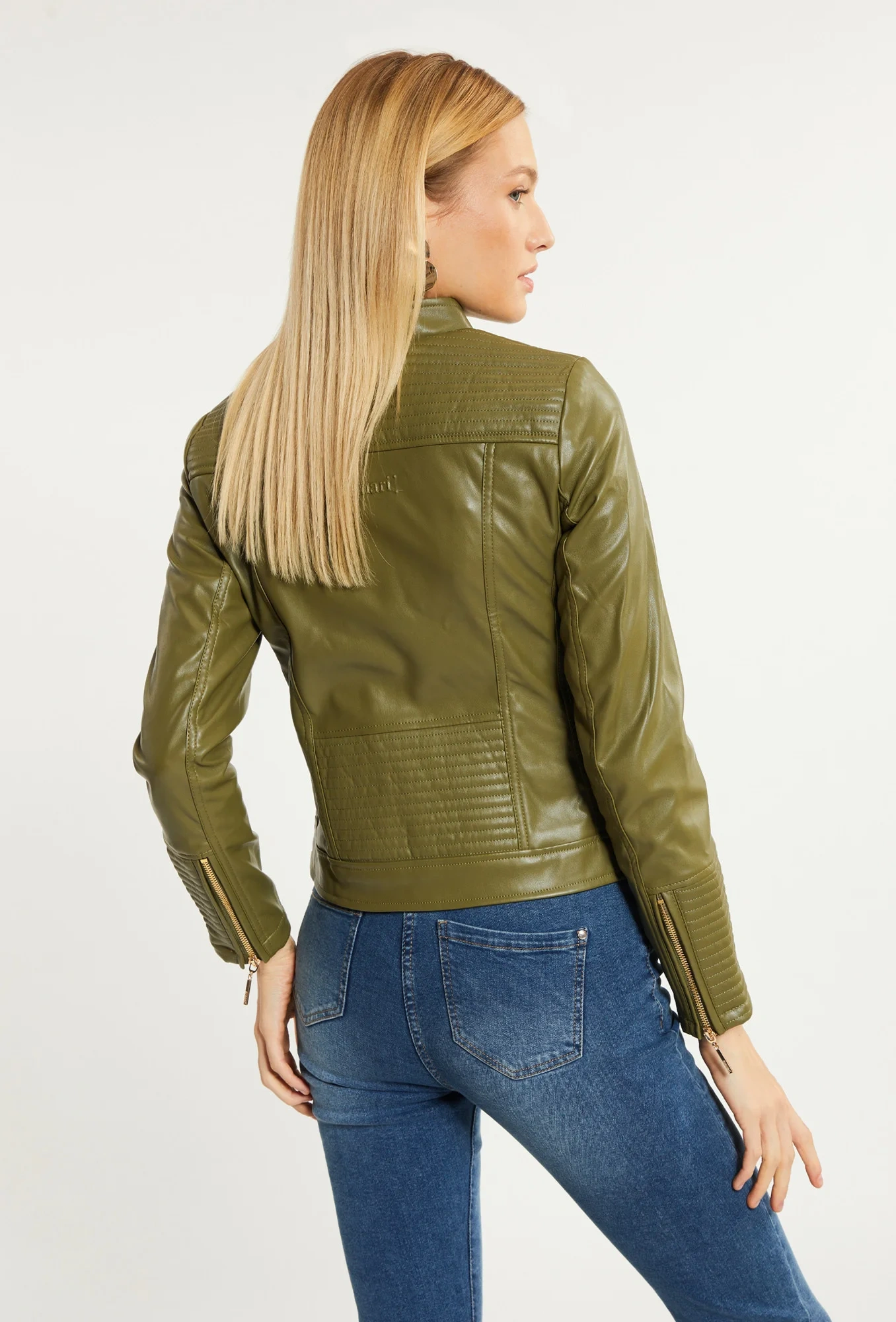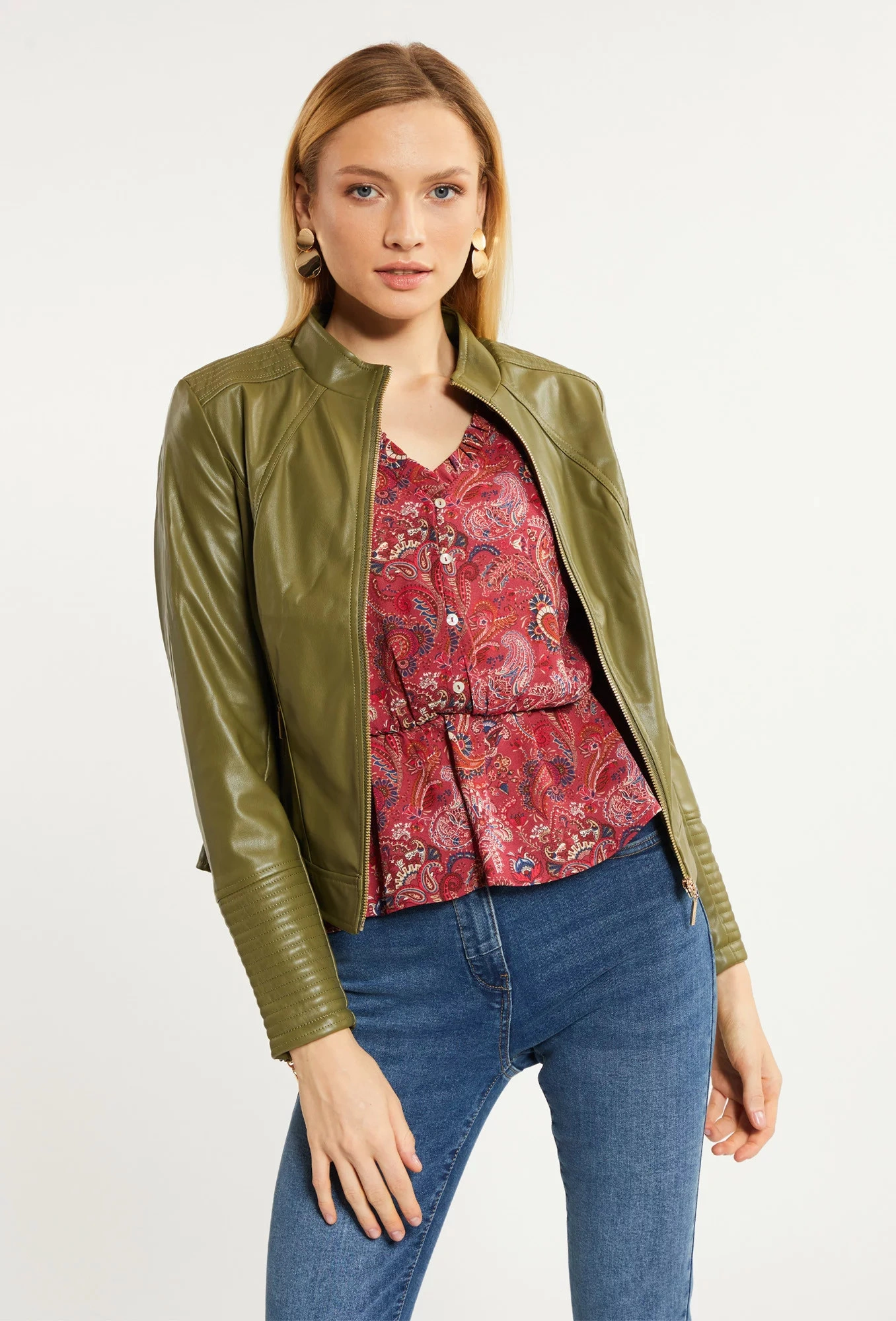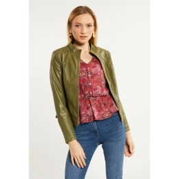 Dámská bunda se stojáčkem, vyrobená z ekologické kůže. Bunda s dlouhými rukávy se zapínáním na koncích. Bunda na zip. V pase jsou dvě kapsy na zip. Tento model je ideální jako doplněk ke každodenním stylizacím. Modelka na obrázku je 177 cm vysoká a má velikost 36.