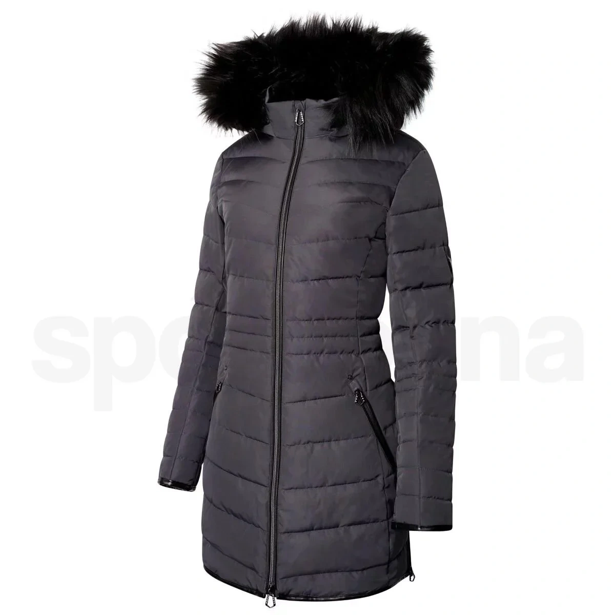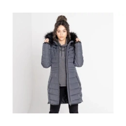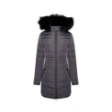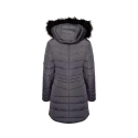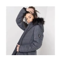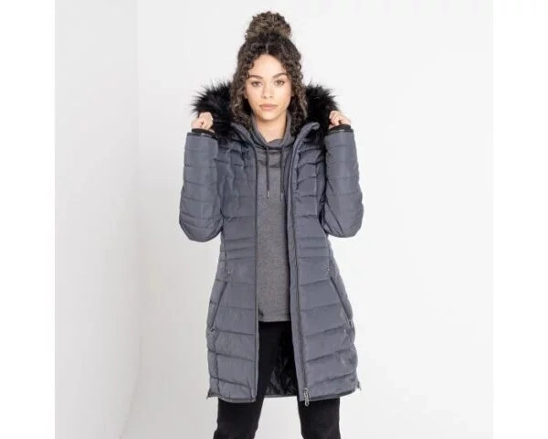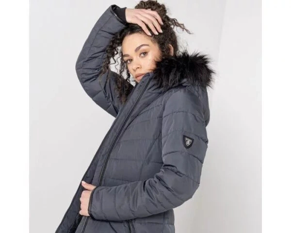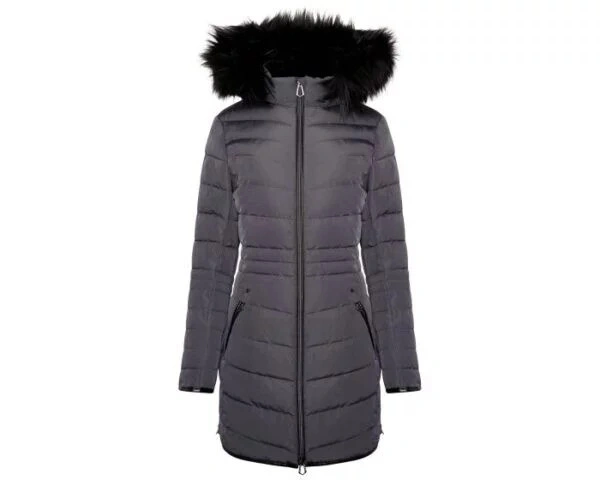 Długa, pikowana kurtka wykonana z wodoodpornego i oddychającego materiału ARED 5000. Miękka w dotyku i lśniąca z pochlebnymi liniami cięcia. Wygodna wyściółka o niskiej objętości zatrzymująca ciepło. Dopasowany kaptur obszyty odpinanym jedwabiście miękkim sztucznym futerkiem. Bujny aksamitny ozdobny kołnierz ozdobiony kryształkami Swarovskiego dla odrobiny luksusu.