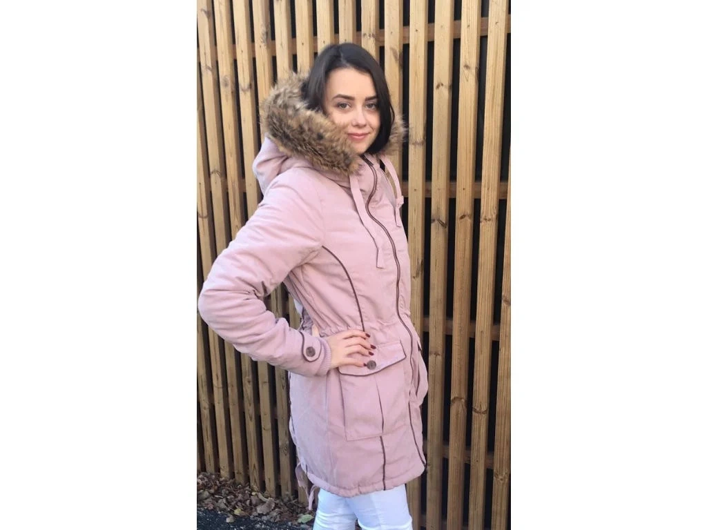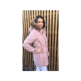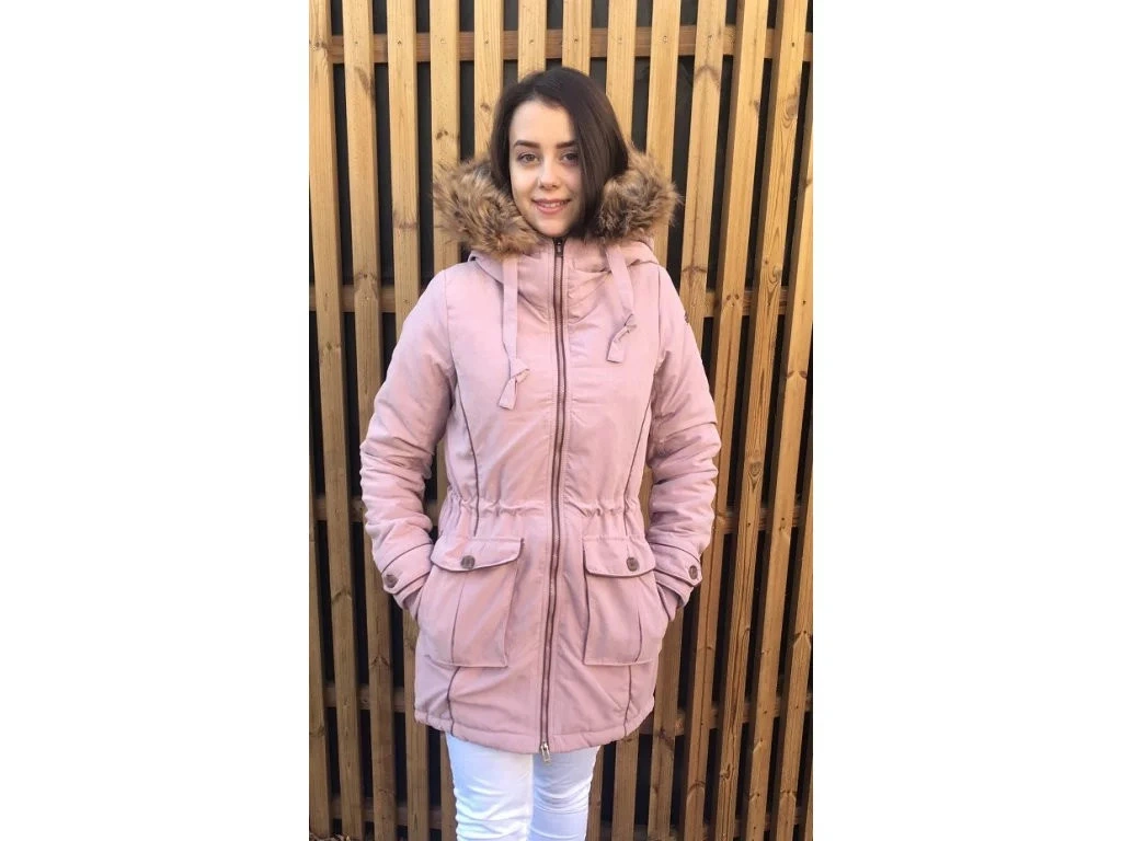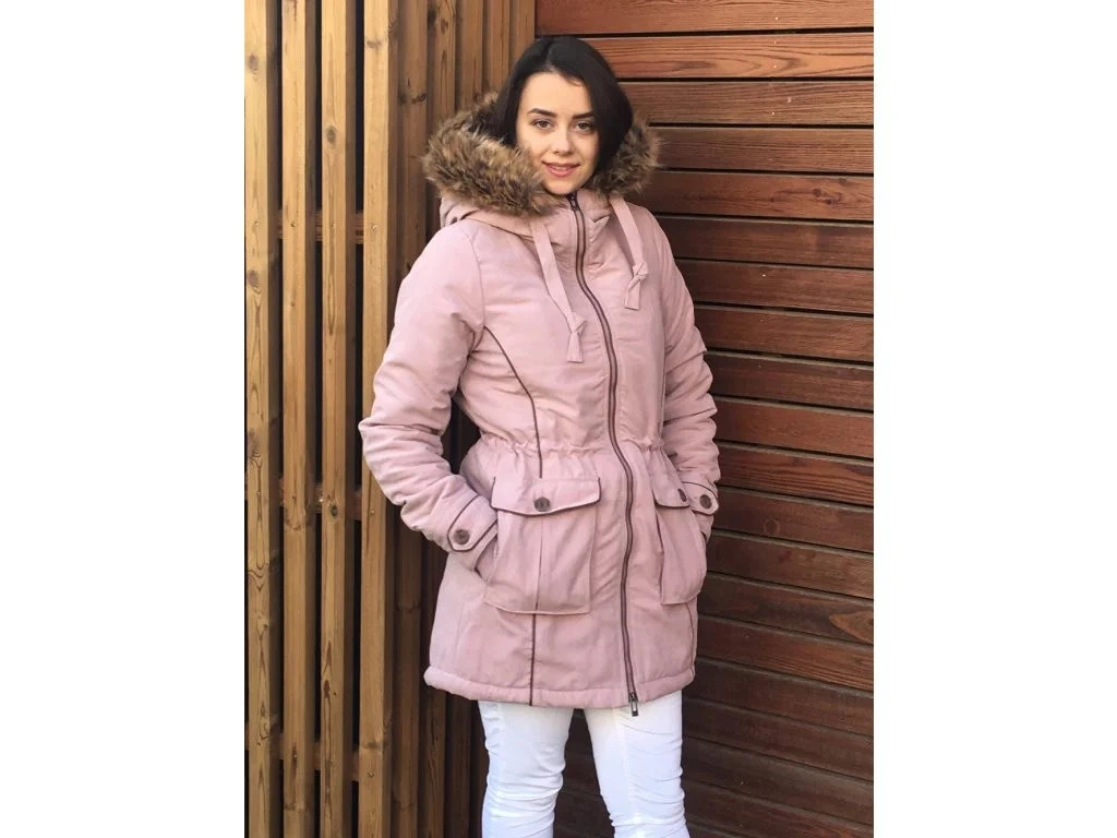 Damska kurtka zimowa ma kaptur ściągany sznurkiem z odpinanym futerkiem. Szerokość talii można regulować za pomocą dodatkowych sznurków, podobnie jak dół płaszcza.Z przodu płaszcza znajdują się dwie funkcjonalne kieszenie, rękawy wykończone są naszytą patką z otworami na kciuki. Kurtka jest również wyposażona w wewnętrzną kieszeń na piersi. Wewnętrzne futro zapewnia wspaniałe uczucie ciepła w zimie.Zdobądź ten modny element do swojej garderoby.