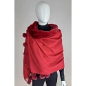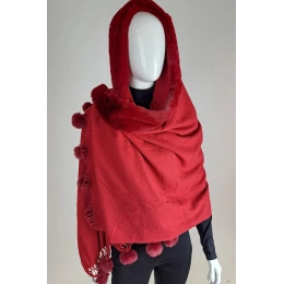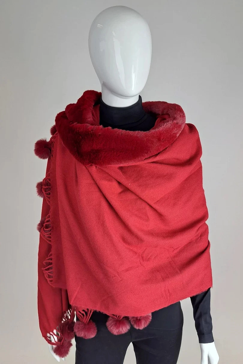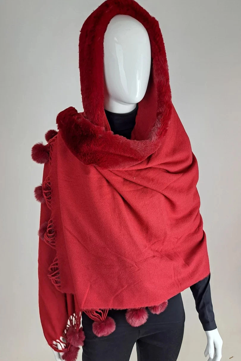 Piękny duży szal z dołączonym kołnierzem ze sztucznego futra i pomponem. Niezwykle miękki i przyjemny w dotyku materiał przypominający kaszmir