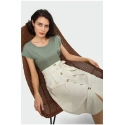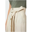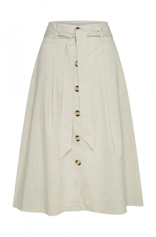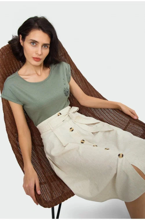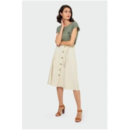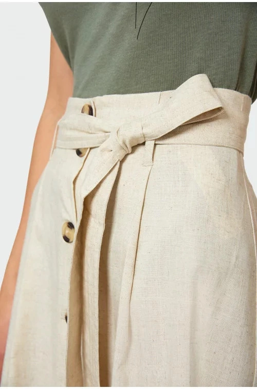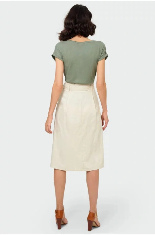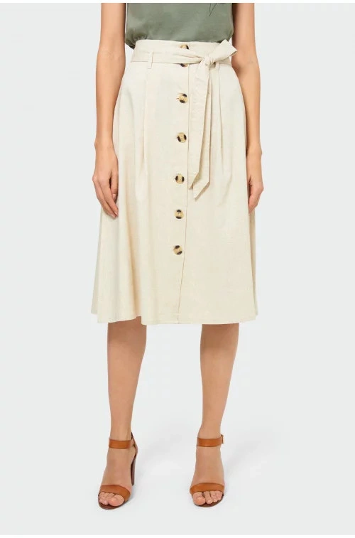 Elegancka spódnica z wysokim stanem. Długość poniżej kolana. Zapięcie na guziki na całej długości z przodu. Dołączony pasek w talii podkreśla sylwetkę. Swobodny krój. Wykonana z przyjemnego w dotyku materiału. Modelka na zdjęciu ma 179 cm wzrostu i nosi rozmiar 36.