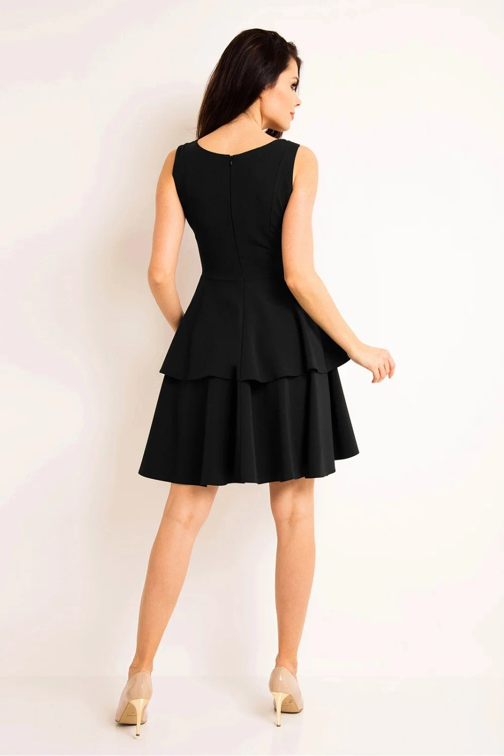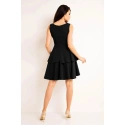Sukienka bez rękawów z krytym zamkiem błyskawicznym. Dopasowana góra, lekko rozkloszowany dół z falbankami. Idealny na wiele okazji.