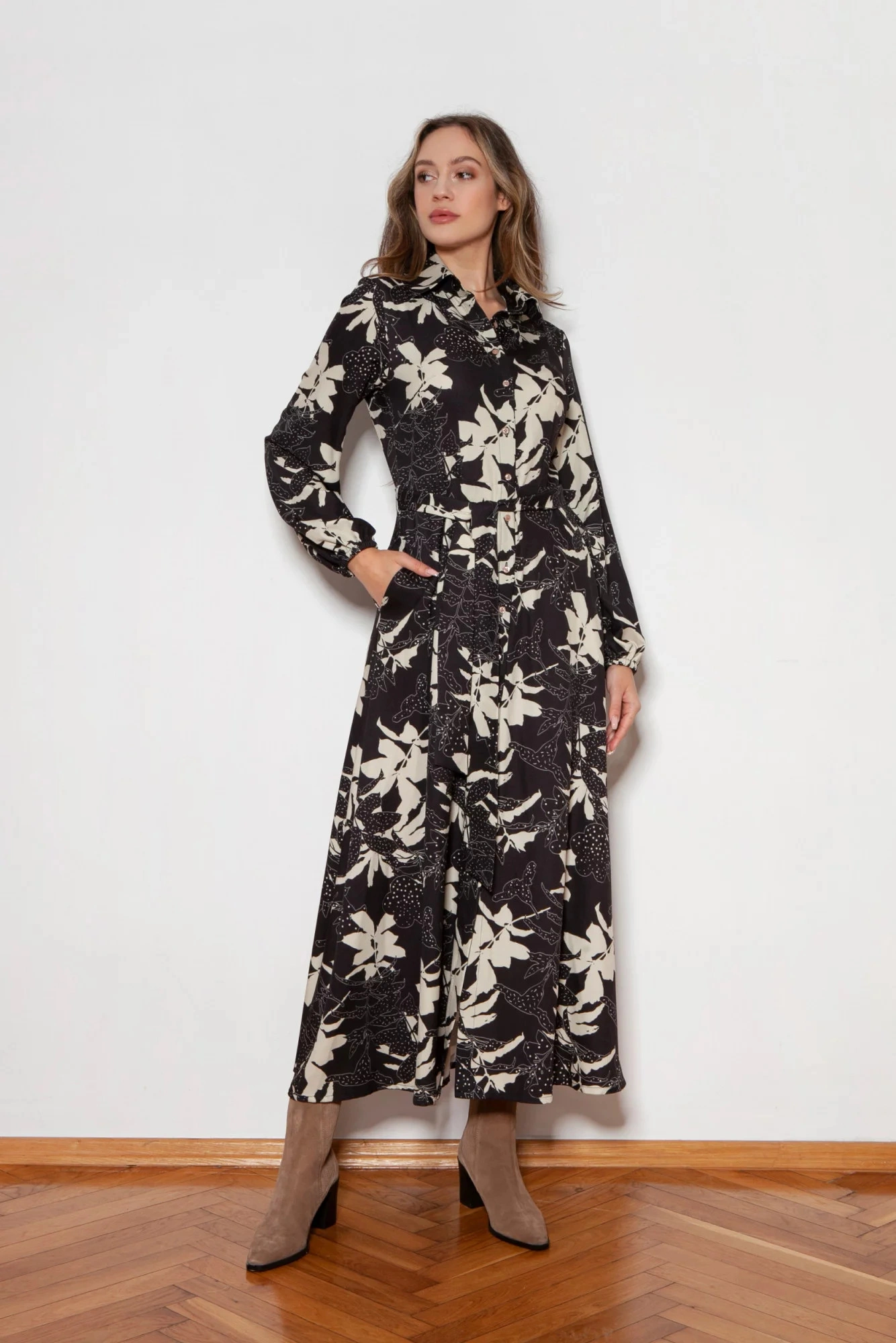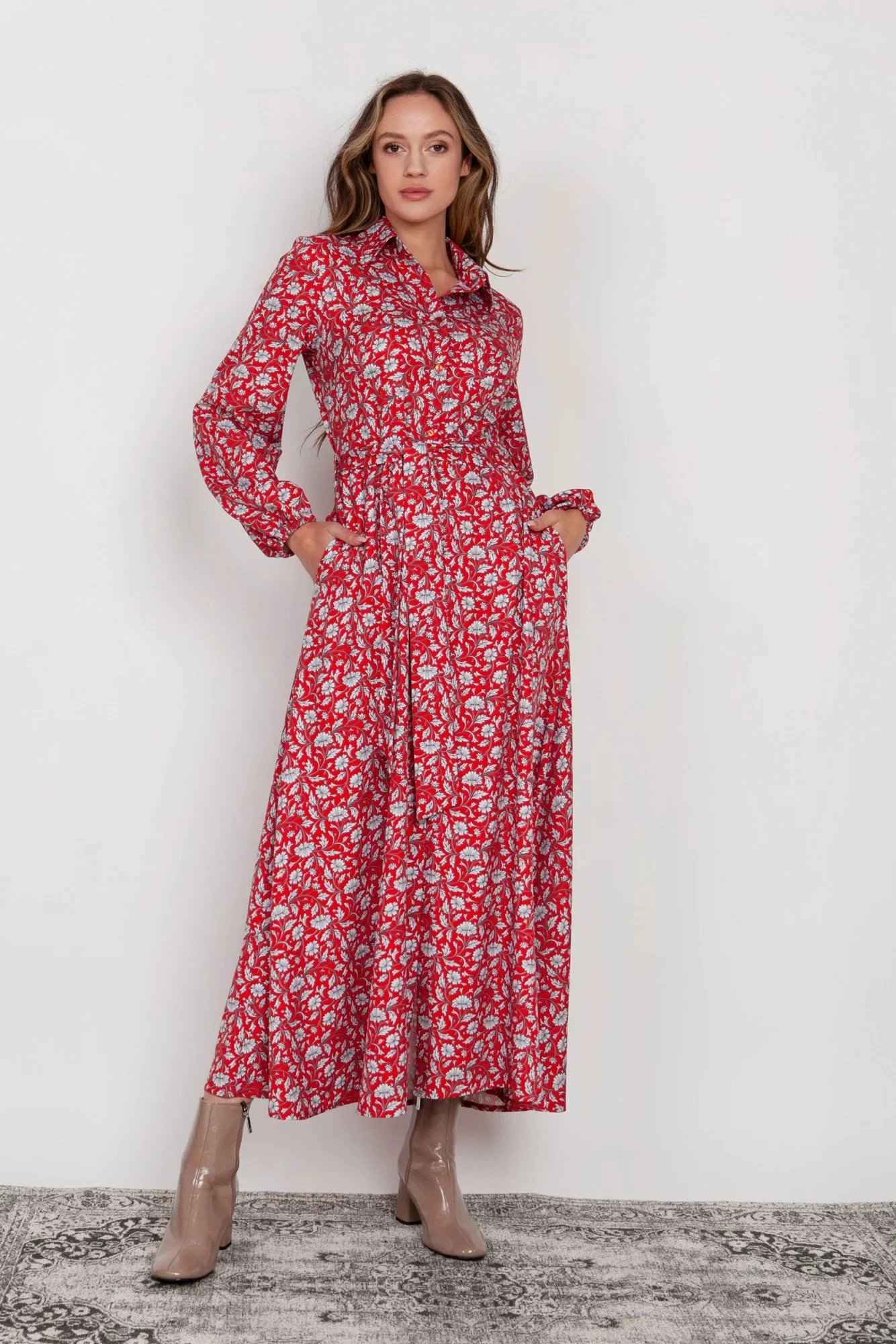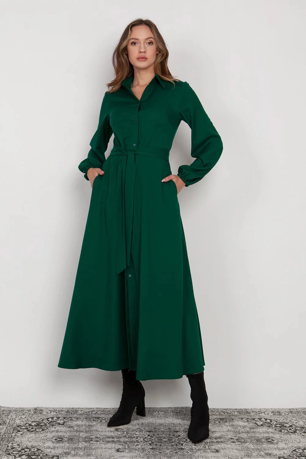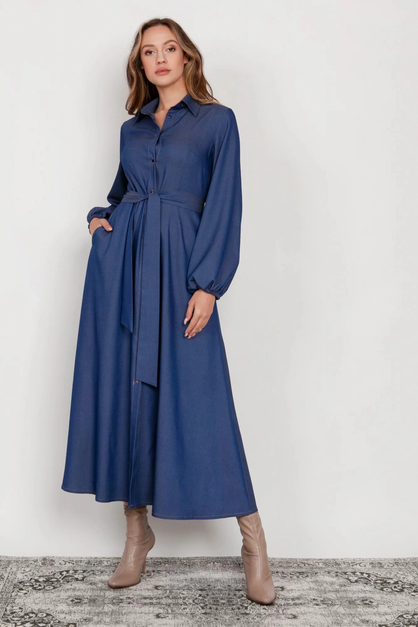 Długa sukienka koszulowa z zapięciem na guziki. Rozkloszowany dół z szarfą wiązaną w pasie ze szlufkami. Długie rękawy wykończone gumką. Wykonana z dbałością o najdrobniejsze szczegóły. I tak, oczywiście ma kieszenie!