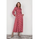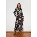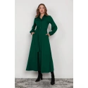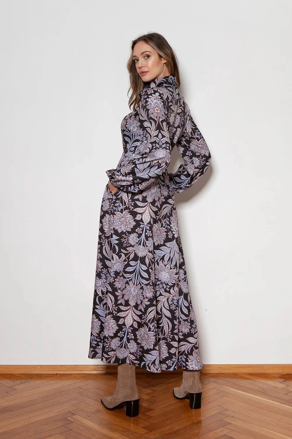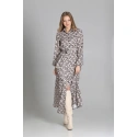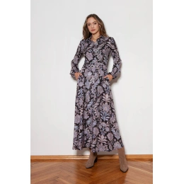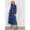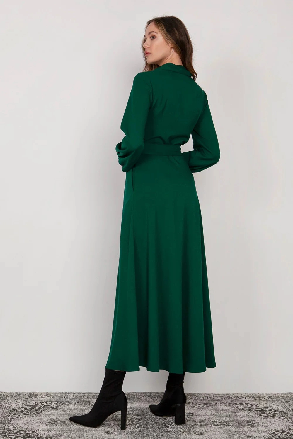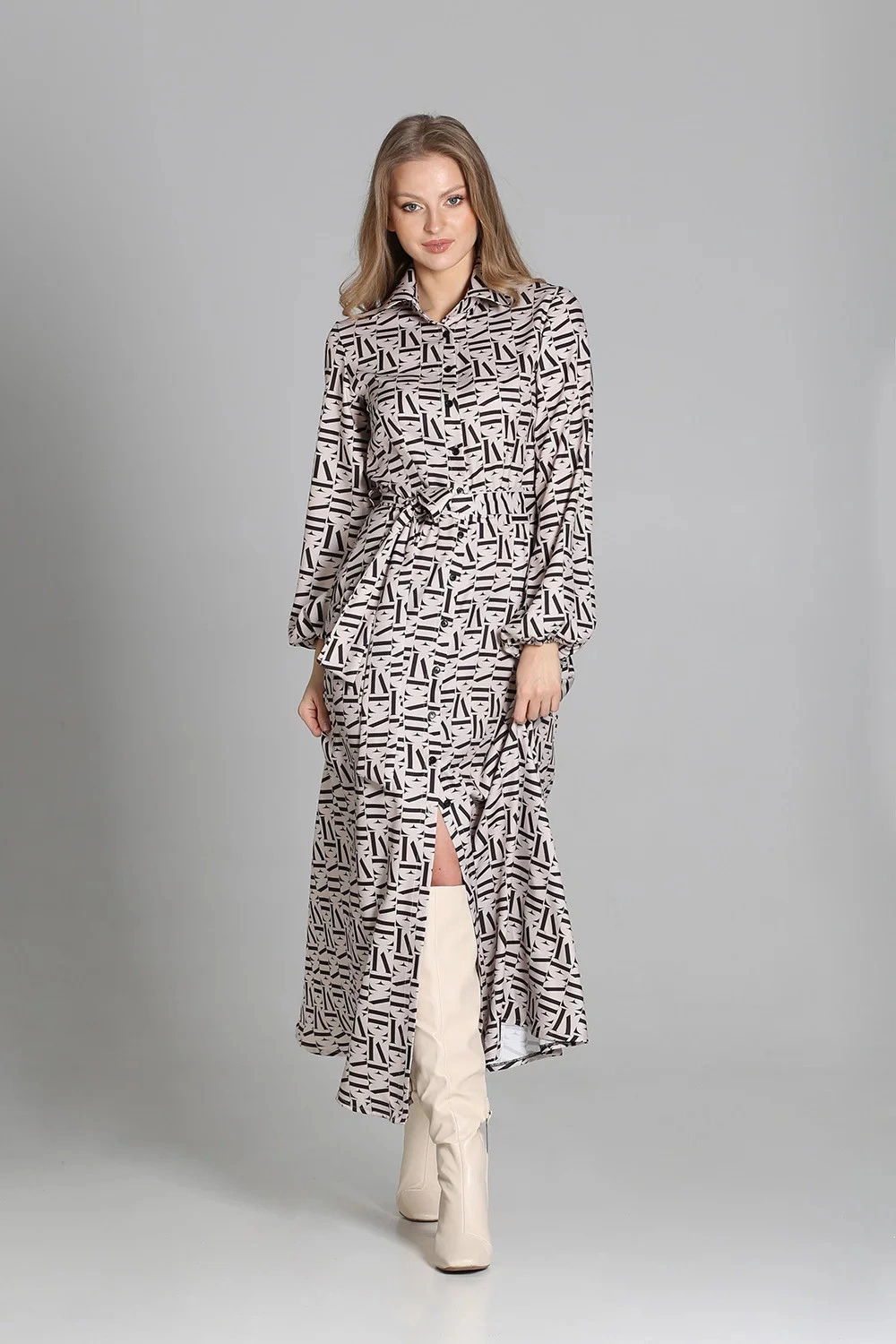 Długa sukienka koszulowa z zapięciem na guziki. Rozkloszowany dół z szarfą wiązaną w pasie ze szlufkami. Długie rękawy wykończone gumką. Wykonana z dbałością o najdrobniejsze szczegóły. I tak, oczywiście ma kieszenie!