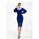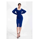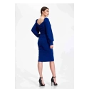 Sukienka koktajlowa midi z elastycznego materiału z długimi bufiastymi rękawami zakończonymi rozpinanym mankietem. Wciągany dekolt. Ozdobne marszczenia z przodu i z tyłu sukienki. Drobne rozcięcie u dołu z przodu. Sukienka bez podszewki i bez zapięcia.