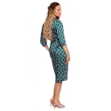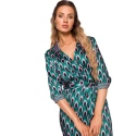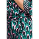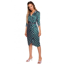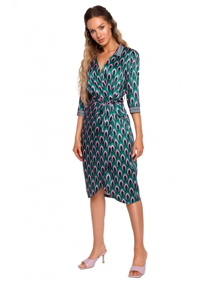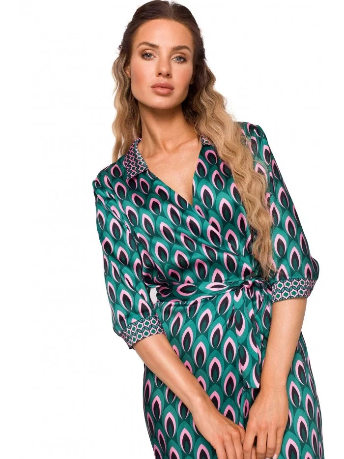 Sukienka jest elegancka, kobieca i wyjątkowa. Ta zawijana sukienka jest wykończona zapięciem na krawat i wykonana z wygodnego satynowego materiału z geometrycznym nadrukiem w różnych żywych kolorach. INFORMACJE O PRODUKCIE: tkanina satynowa z nadrukiem zawijana sukienka z kołnierzykiem wiązana z boku ukryty guzik z jednej strony bez podszewki długość poniżej kolan krótkie rękawy wykończone mankietami zapinanymi na guziki nasza modelka ma 171 cm wzrostu i nosi rozmiar S