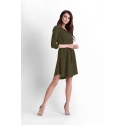 Sukienka ma koszulową górę - ma standardowy kołnierzyk i dekolt w kształcie litery V.