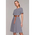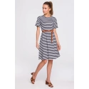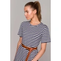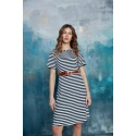 Dżersej wiskozowy w paski. Sukienka o kroju litery A. Długość powyżej kolan. W zestawie znajduje się pasek z klamrą. Nasz model ma 174 cm wzrostu i nosi rozmiar S.
