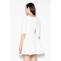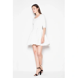 Piankowa sukienka z rozkloszowanym dołem. rękawy 3/4, okrągły dekolt, szerokie rozcięcie u dołu ładnie dopasowują się do sylwetki. Całość wygląda bardzo kobieco.