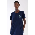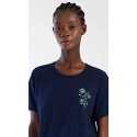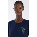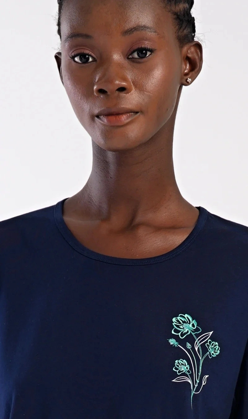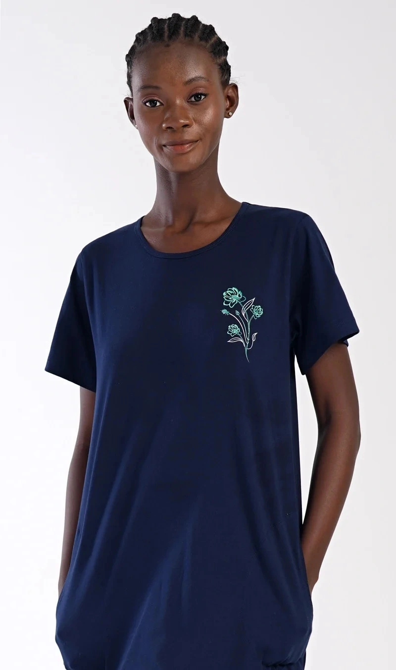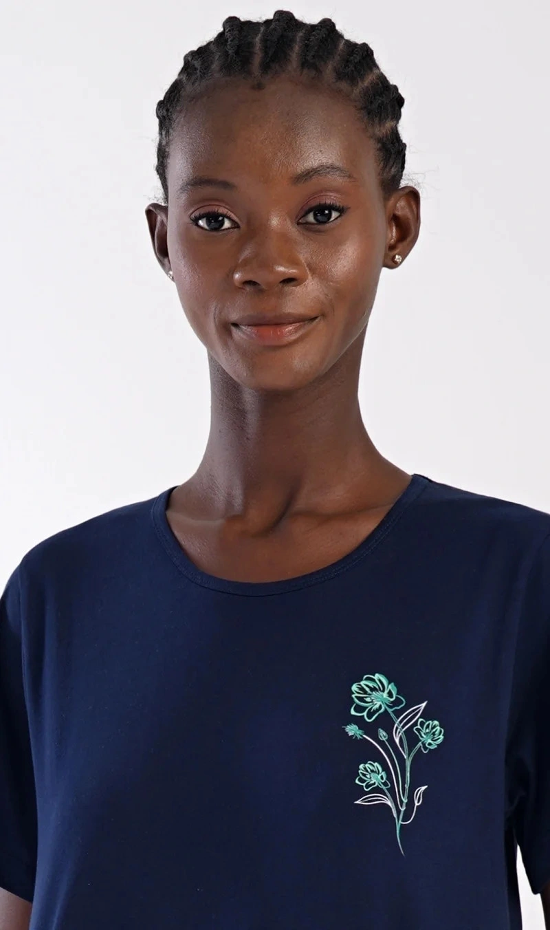 Dámské bavlněné domácí šaty s krátkým rukávem Zuzka. Domácí jednobarevné šaty s kulatým výstřihem a kapsami zdobí na hrudi obrázek květů.