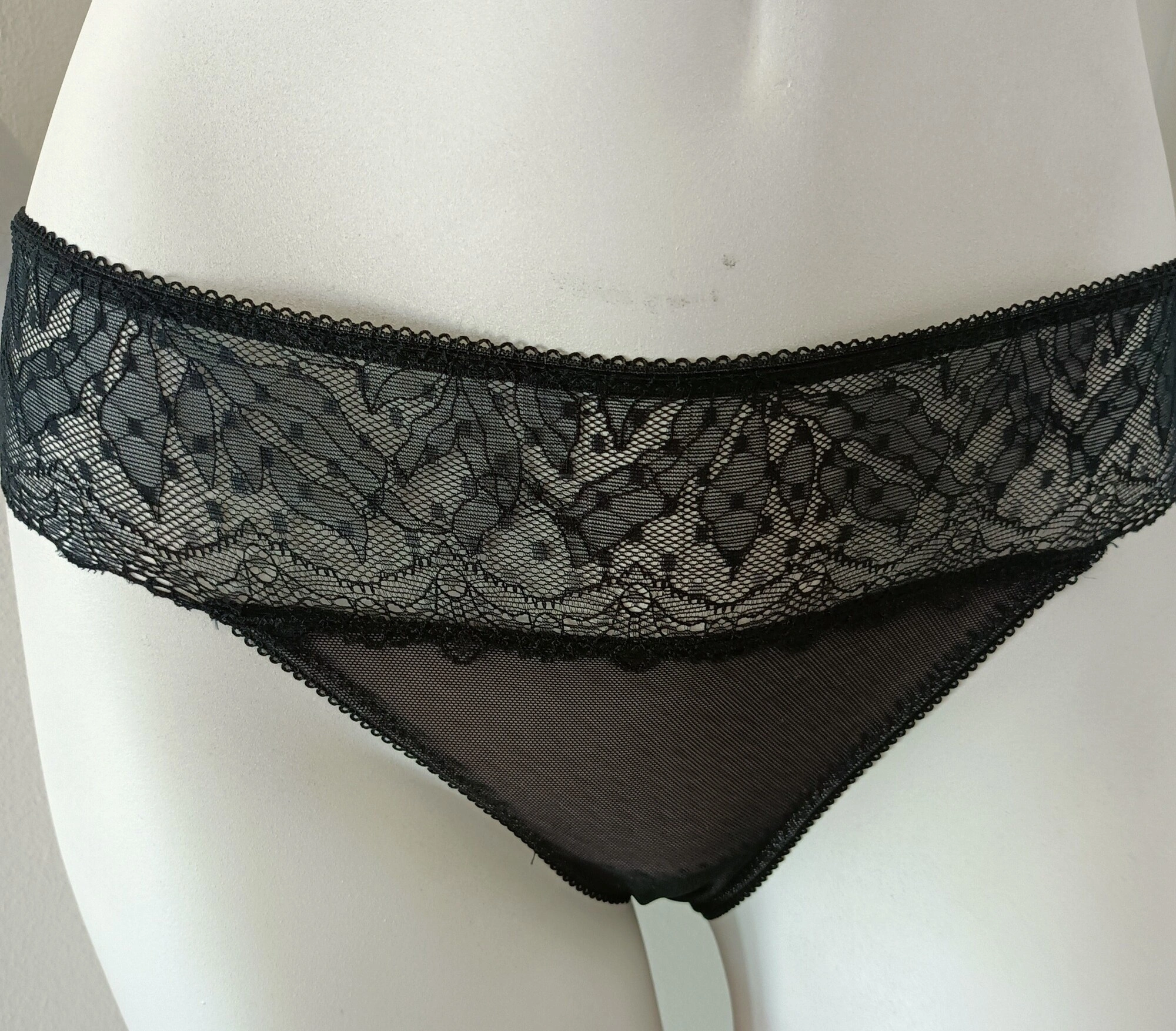 Klasyczne czarne figi, tym razem z szerokim koronkowym wykończeniem.Niczym seksowny pas zdobi biodra i wygląda wyjątkowo zmysłowo.Linia pośladków również otulona koronką.Dół bielizny jest lekko prześwitujący, by pobudzać wyobraźnię.