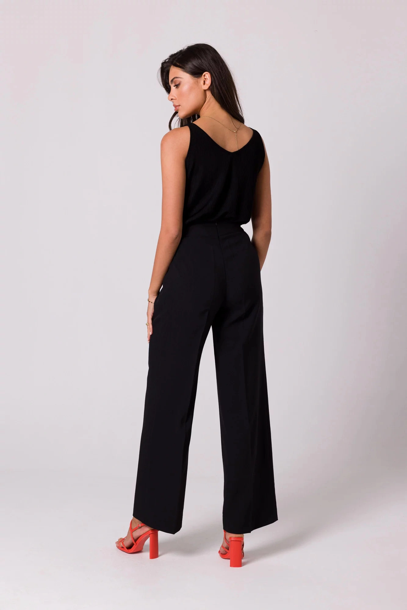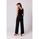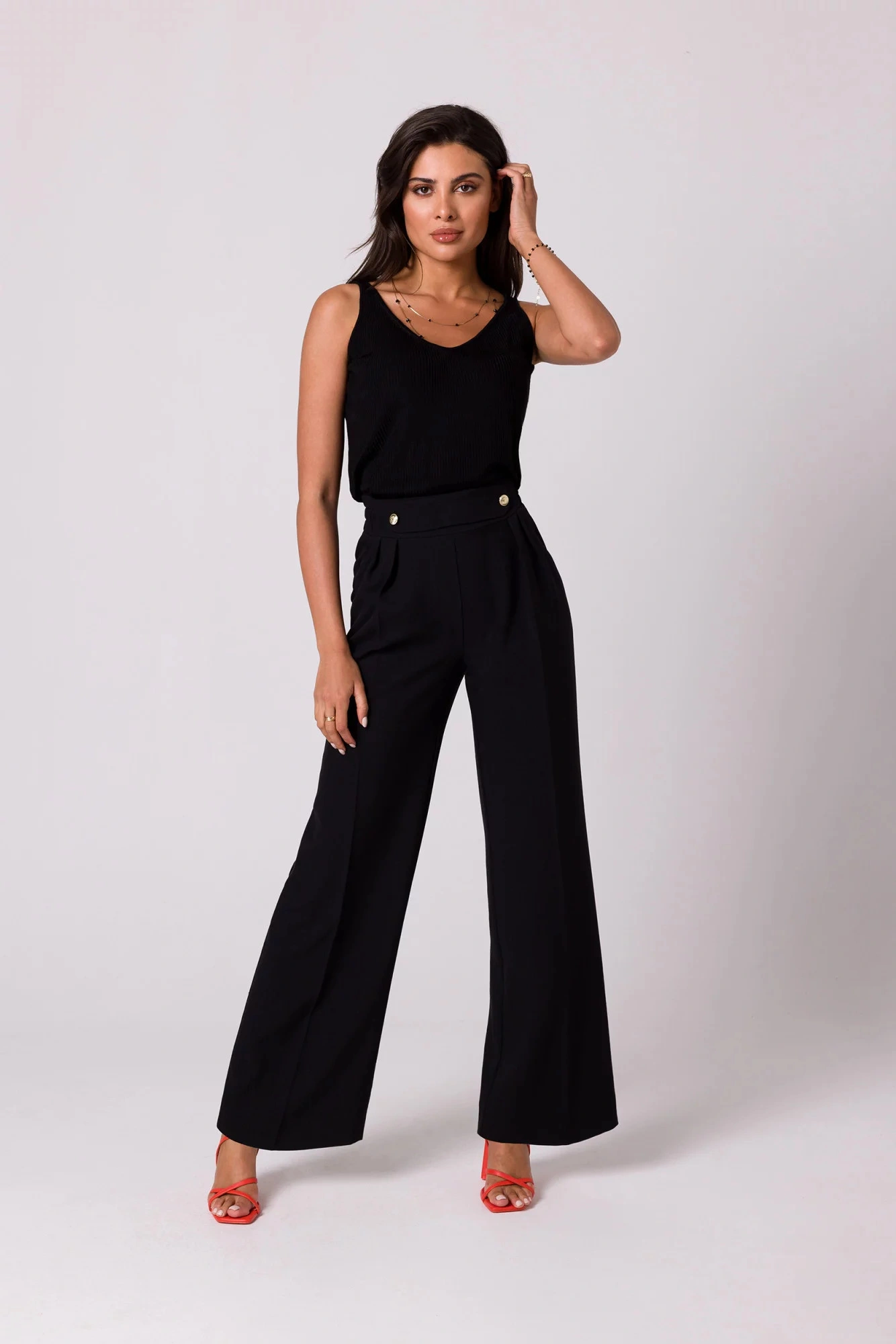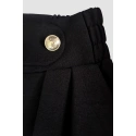 Pokochasz design tych lekkich spodni - szerokie nogawki z zakładkami, częściowo elastyczny pas i ozdobne złote guziki z przodu.