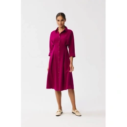 SZCZEGÓŁY PRODUKTU: sukienka z tkaniny z kołnierzykiem zapinanym na guziki rozkloszowany fason z fiszbinami w talii rękawy 3/4 z mankietami długość poniżej kolan bez podszewki Modelka ma 174 cm wzrostu i nosi rozmiar S. Zaprojektowano i wykonano w Polsce