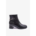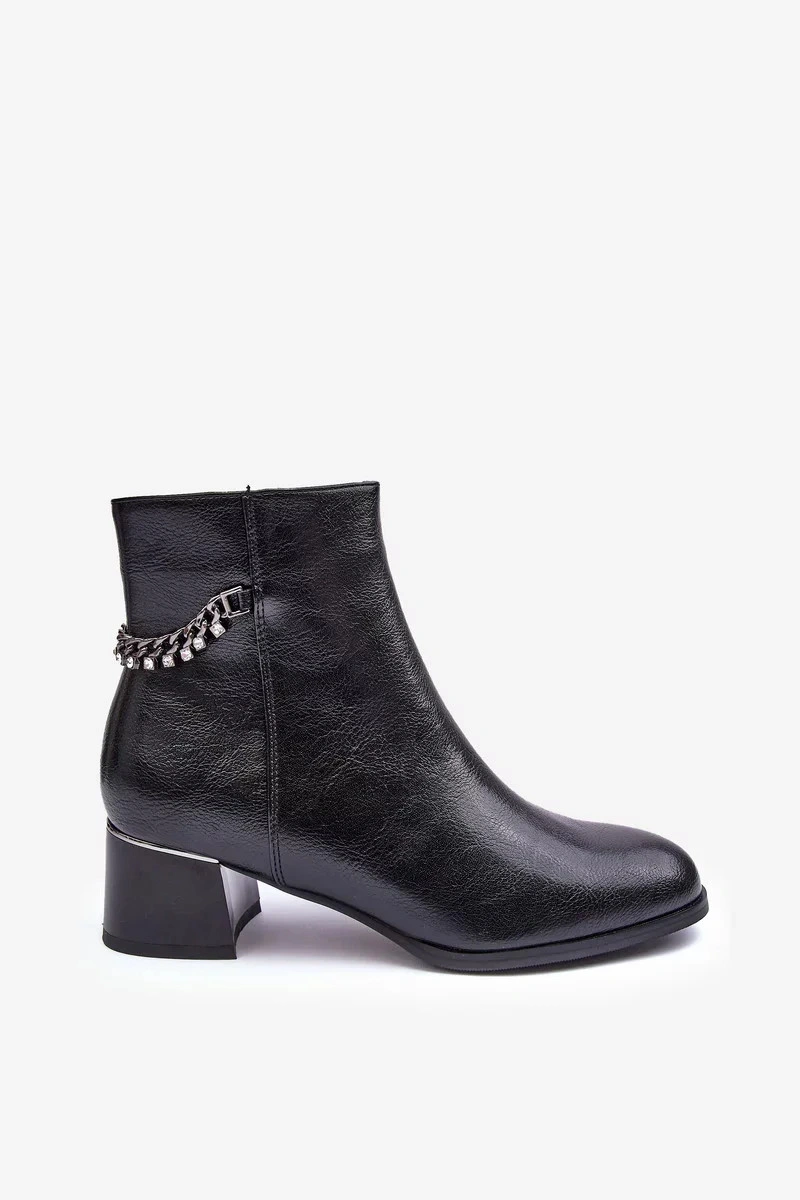 Klasické dámské boty na nízkém podpatku s lesklým prvkem. Vyrobeno z ekologické kůže. Zapíná se na zip na vnitřní straně. Horní část je ozdobena řetězem s kamínky. Vnitřek je zateplen kožešinou. Špička je zesílená a špička je zaoblená. Při výběru velikosti se řiďte tabulkou velikostí.