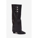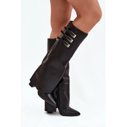 Dámské kozačky z ekokože s stylovým střihem a ohrnutým límcem spojují eleganci a moderní design. Zapínají se na zip, mají špičaté špičky, opticky prodlužují nohy. Stabilní podpatek zajišťuje pohodlí po celý den. Na límci jsou tři pásky s stříbrnými sponami, které dodávají obuvi jedinečný charakter. Zateplení vnitřním polštářem zaručuje teplo, čímž jsou ideální volbou na chladnější dny.