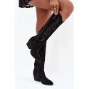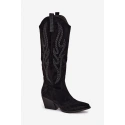 Dámské kozačky z ekokože, osazené na sloupcovém podpatku, jsou stylovým návrhem na chladnější dny. Svršek sahá až po kolena, co jim dodává klasický vzhled, a ozdoby jim dodávají jedinečný charakter. Špičaté špičky opticky zjemňují nohy, a model se zavíraním na zip na spodní části boty zajistí pohodlí a snadné obouvání. Skvěle se hodí k elegantním i volným stylizacím, ideální na zimní výlety.