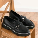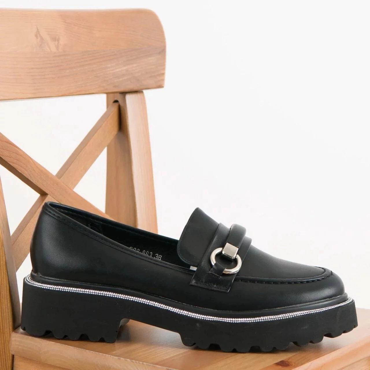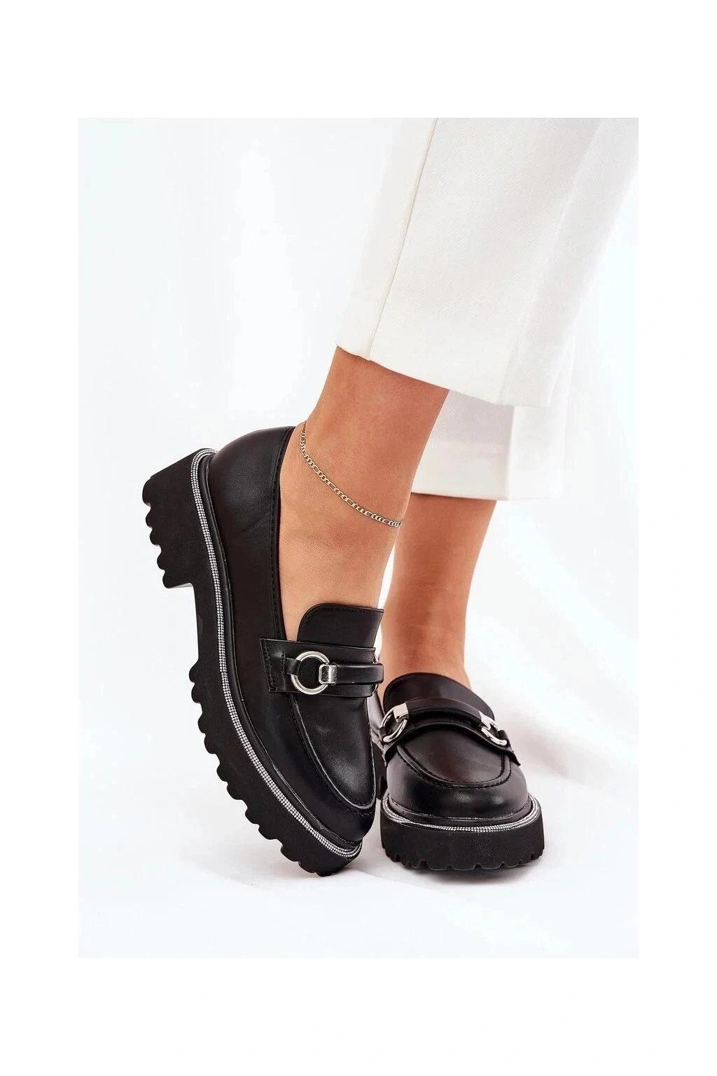 Eleganckie loafersy wykonane z ekologicznej skóry. Ozdobny pasek z przodu dodaje wyjątkowego charakteru, a zaokrąglony nosek zapewnia wygodę przez cały dzień. Podeszwa jest ozdobiona dżetami, które dodają odrobiny blasku. Idealne do noszenia na co dzień, te loafersy świetnie pasują do różnych stylizacji.