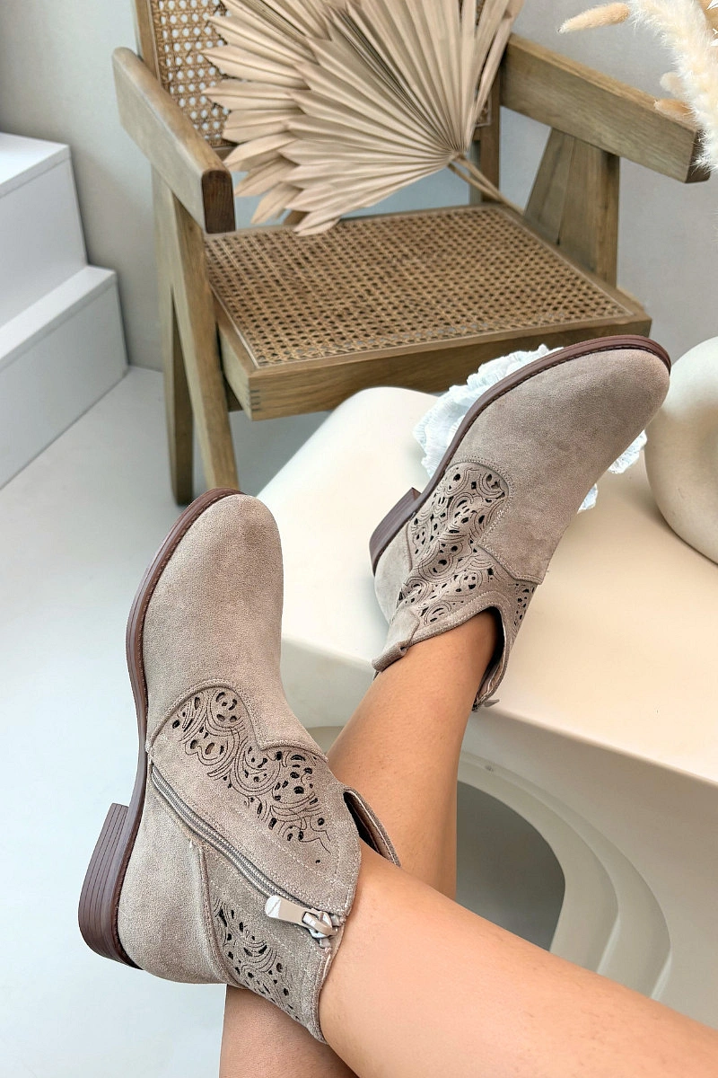 Dámské kotníkové boty značky S.Barski jsou spojení pohodlí a nadčasového stylu. Vyrobeny z eko semiše. Model s plochým podpatkem zajišťuje stabilitu a komfort při každodenním nošení, zaoblené špičky dodávají klasický vzhled. Otevřená část s perforacemi přináší jemný, ženský akcent, který model zvýrazňuje a dodává mu lehkost. Zapínání na zip umožňuje rychlé a pohodlné obouvání. Jsou to univerzální boty, které skvěle doplní jak každodenní outfity s kalhoty, tak i elegantnější sestavy s šaty nebo sukní. Při výběru velikosti se řiďte tabulkou velikostí.