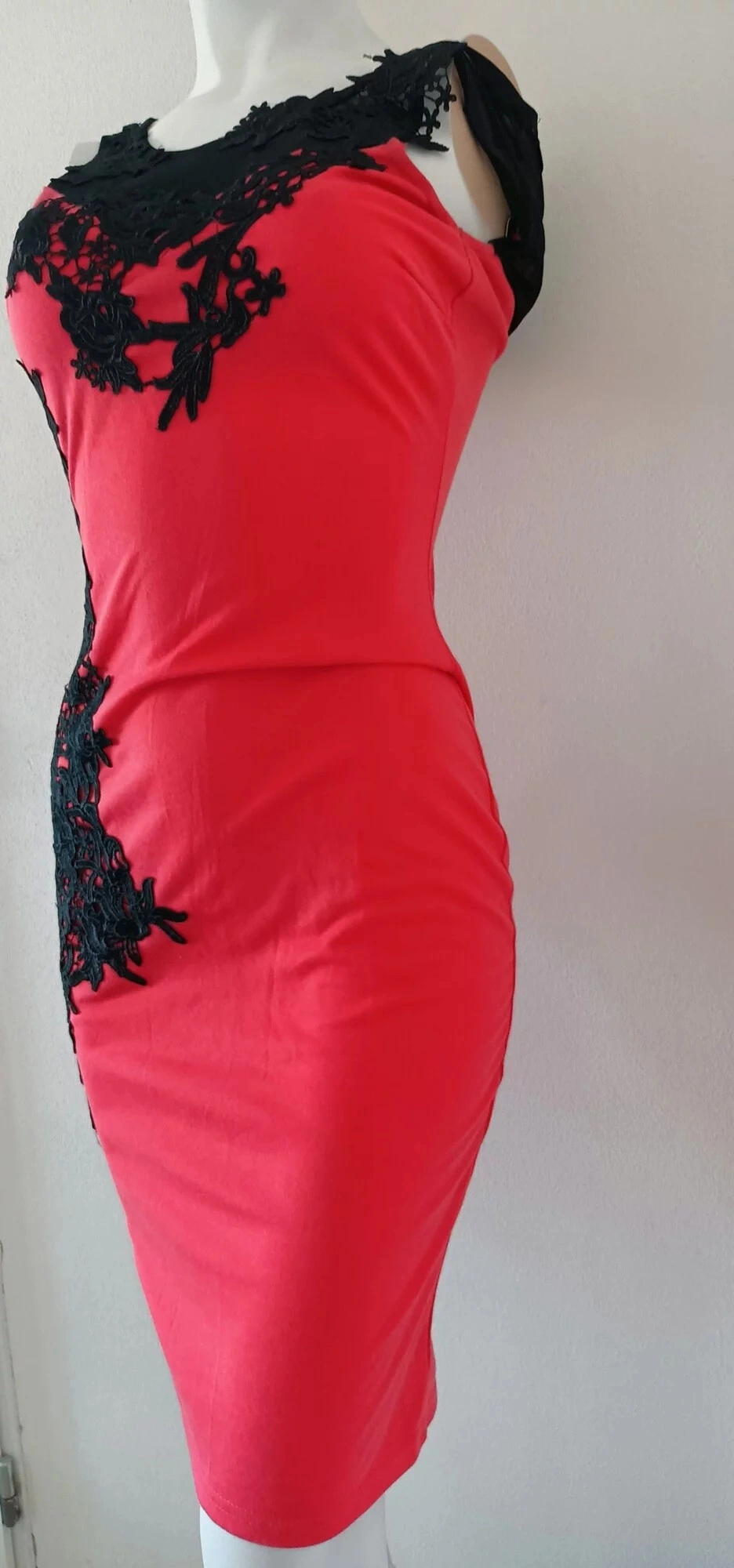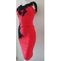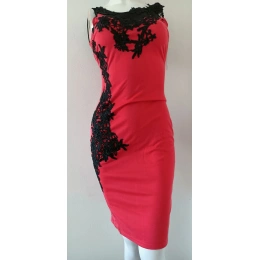 Damska sukienka wykonana z lekkiego materiału, z luksusową koronką wokół szyi. Sukienka jest bez rękawów, z grubymi ramiączkami.