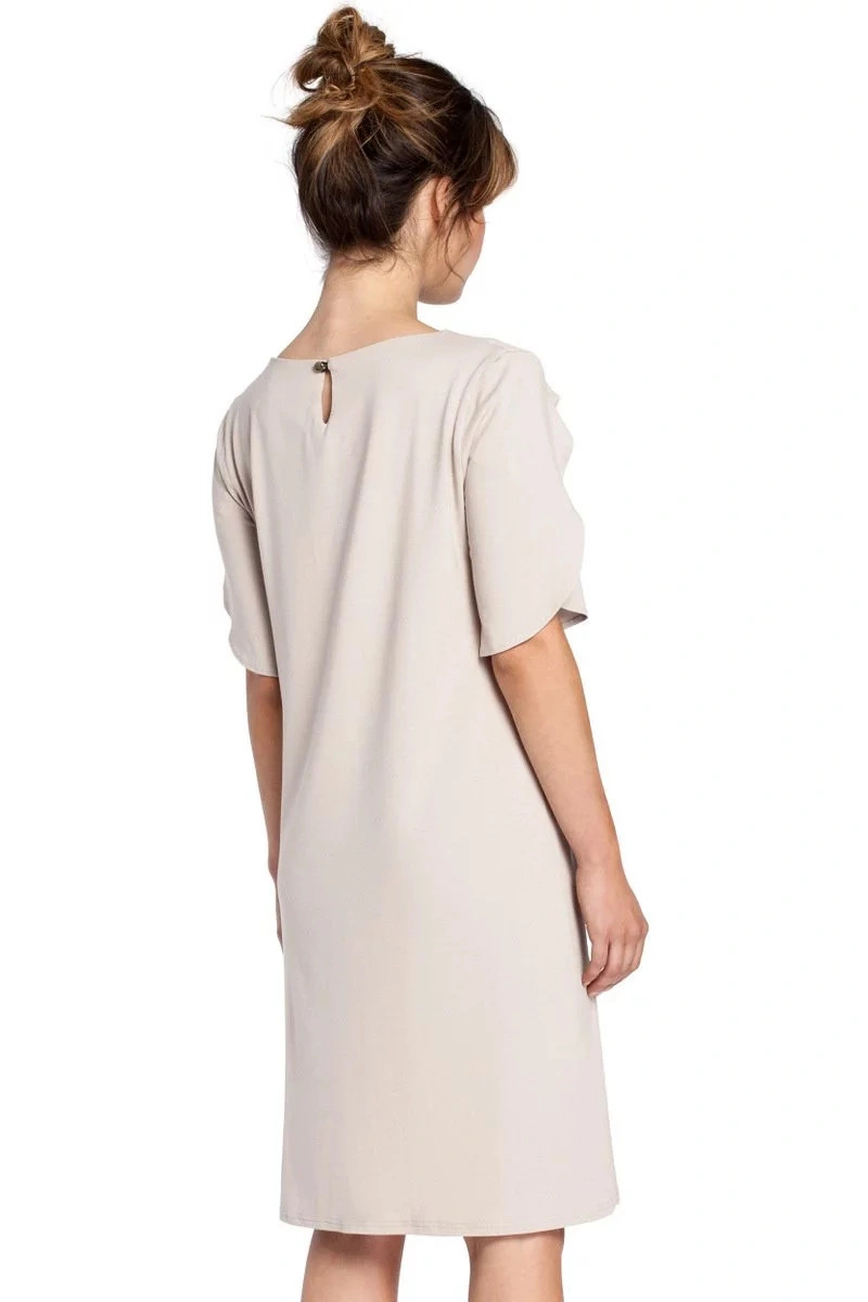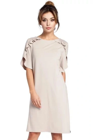 Mini sukienka z dekoltem w łódkę, dwiema szerokimi falbanami i rękawami 3/4. Głęboki dekolt z tyłu.