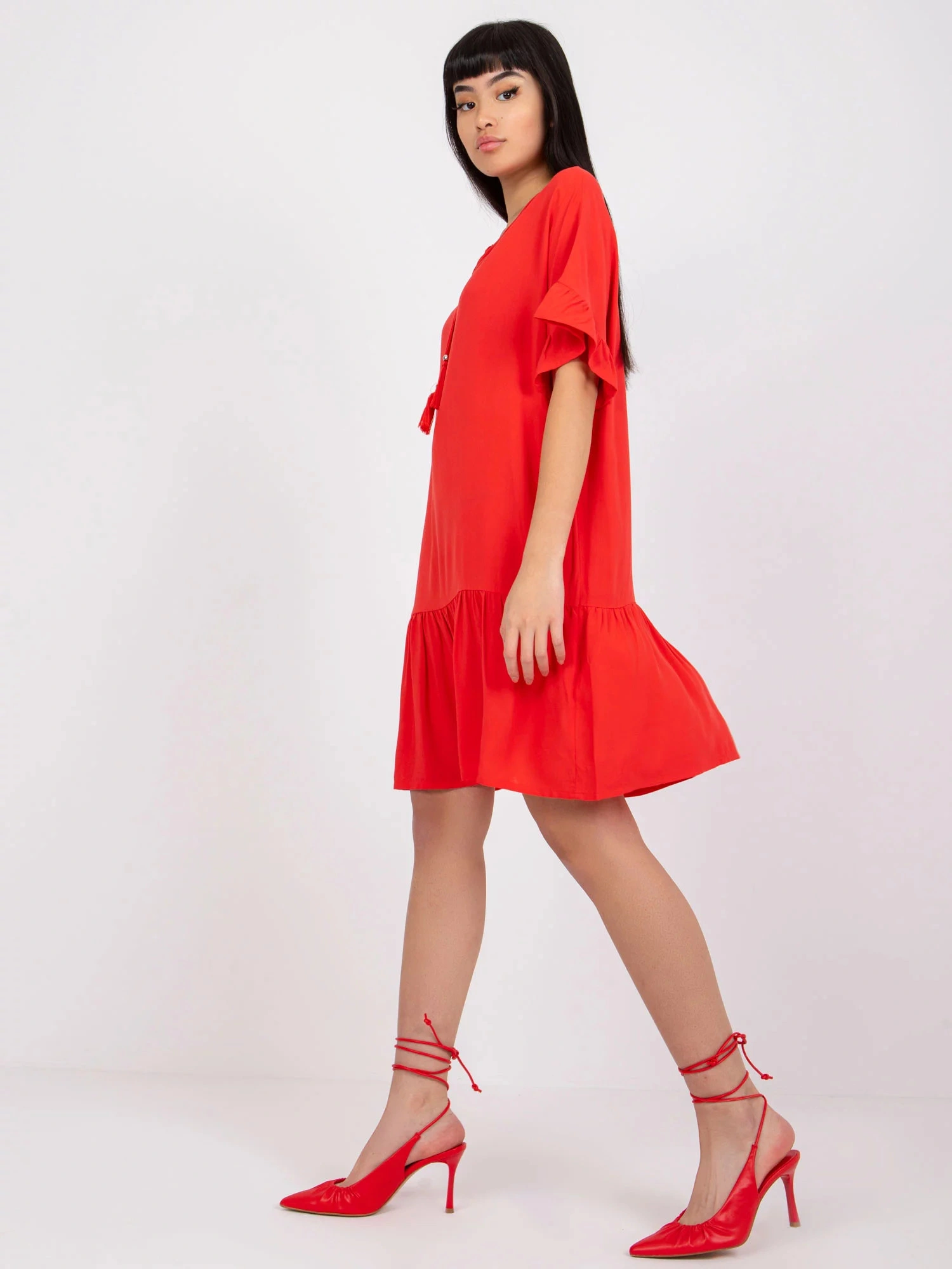Wymiary sukienki w rozmiarze S mierzone na płasko: szerokość pod pachami - 55 cm, długość całkowita - 87 cm.