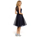 Večerní šaty ke kolenům se síťovaným sedlem a sukní. Šité detaily a zavazování na zádech s klíčovou dírkou.