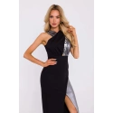 Tkanina i dzianina metaliczna, sukienka maxi, dekolt na krzyż, wysokie rozcięcie z przodu, ukryty zamek błyskawiczny z boku, bez podszewki, nasza modelka ma 171 cm wzrostu i nosi rozmiar S, zaprojektowana i wykonana w Polsce.