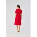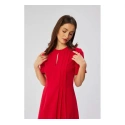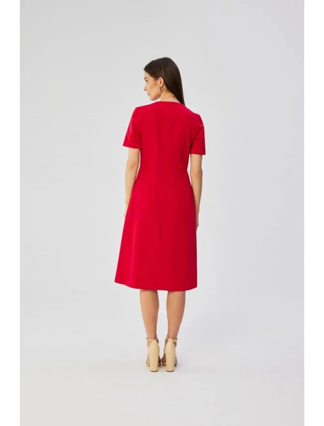 65% poliester 30% wiskoza 5% elastan SZCZEGÓŁY PRODUKTU: tkana sukienka z ozdobnymi zakładkami po bokach dekolt w kształcie dziurki od klucza krótkie rękawy z zakładką poniżej kolan ukryty zamek błyskawiczny z tyłu bez podszewki nasza modelka ma 176 cm wzrostu i nosi rozmiar S zaprojektowano i wykonano w Polsce
