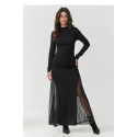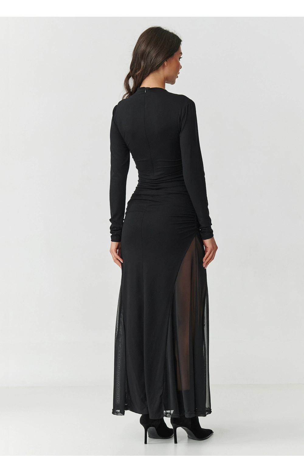 Objevte neuvěřitelně ženské a elegantní maxi šaty, vytvořené pro ženy, které oceňují klasiku s nádechem smyslnosti. Přizpůsobený střih krásně zdůrazňuje postavu, vystavujíce ženské tvary jemným, ale výrazným způsobem. Hluboké a průhledné vložky z tylu po stranách dodávají celému outfitu lehkost a sex appeal a výjimečný charakter. Zakrytý, klasický výstřih je poklonou nadčasové eleganci, vyvažuje odvážnější prvky šatů a dokonale zdůrazňuje linii krku a ramen. Právě tento kontrast dělá celkový dojem stylovým, elegantním a trochou tajemným. Na zádech šatů je diskrétní, skrytý zip, který zajišťuje pohodlné oblékání a perfektní přizpůsobení postavě. Jedná se o praktické řešení, které neodvádí pozornost od efektního střihu, a zároveň zajišťuje pohodlí nošení. Šaty jsou k dostání pouze v klasické, nadčasové černé barvě, která zdůrazňuje jejich eleganci a univerzální charakter. Jedná se o odstín, který nikdy nevyjde z módy, zúžuje postavu a dělá, že outfit vždy vypadá elegantně. Jedná se o ideální návrh na speciální příležitosti, kdy chcete cítit krásně, sebevědomě a výjimečně. Nejde jen o šaty, je to způsob, jak vyjádřit sebe sama.