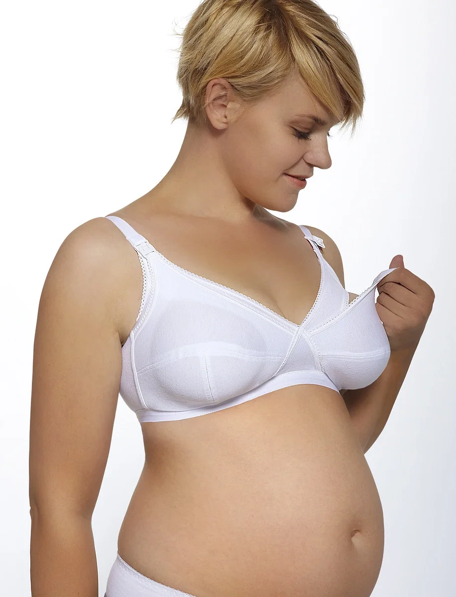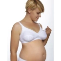 Biustonosz ciążowy z odpinaną miseczką w kolorze białym. Wykonana jest z wysokiej jakości cienkiej bawełny. Miseczkę można odpiąć za pomocą zapięcia, aby umożliwić wygodne karmienie piersią. Biustonosz jest bez wzmocnień i bez fiszbin. Klasyczne zapięcie na plecach z dwoma haczykami i wyborem trzech pozycji. Regulowane paski na ramiona.
