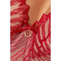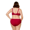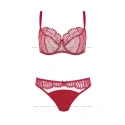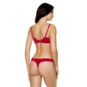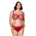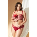 Biustonosz wykonany jest z siateczkowego materiału z fantazyjnym haftem w kolorze głębokiej czerwieni. Miseczki z pionowymi i ukośnymi szwami doskonale unoszą biust i nadają mu ładny zaokrąglony kształt. Połączenie miseczek ozdobione jest satynową wstążką z zawieszką. Boki modelu są wzmocnione pionowymi fiszbinami. Ozdobne paski można regulować, ale nie można ich zdjąć.
