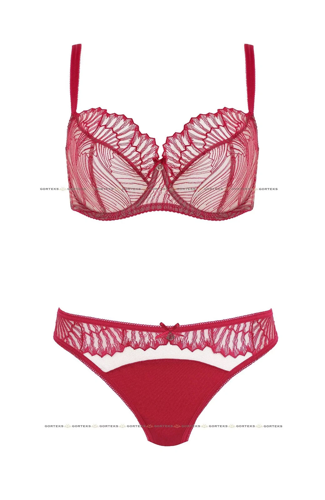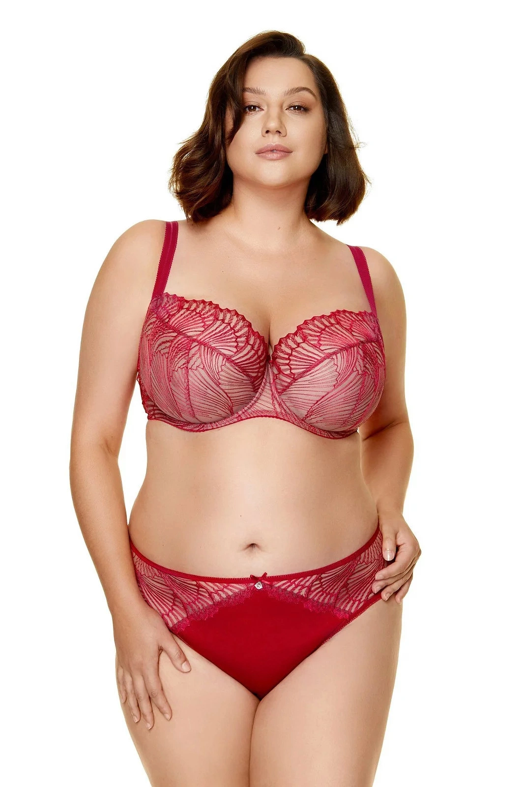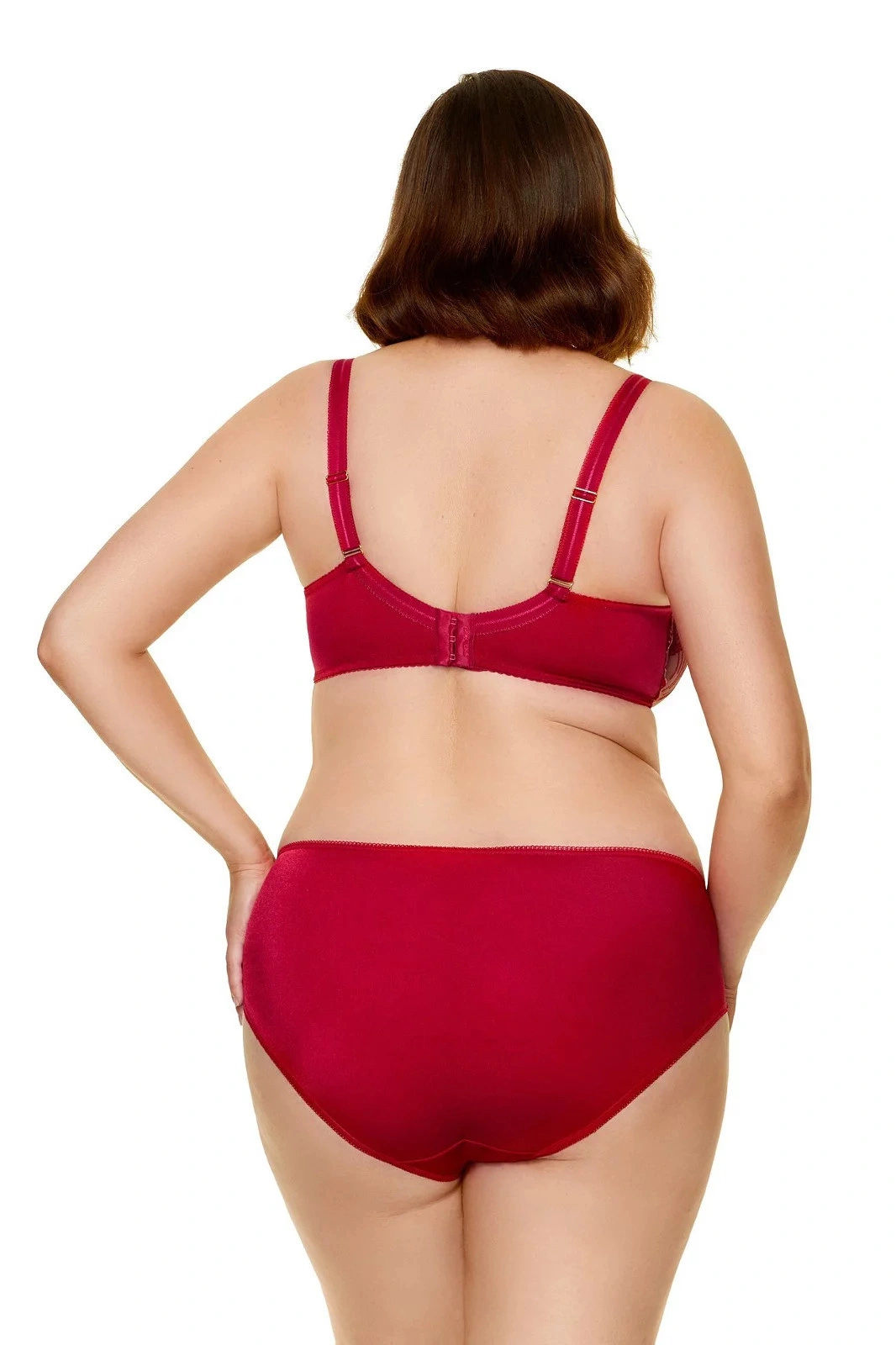 Biustonosz wykonany jest z siateczkowego materiału z fantazyjnym haftem w kolorze głębokiej czerwieni. Miseczki z pionowymi i ukośnymi szwami doskonale unoszą biust i nadają mu ładny zaokrąglony kształt. Połączenie miseczek ozdobione jest satynową wstążką z zawieszką. Boki modelu są wzmocnione pionowymi fiszbinami. Ozdobne paski można regulować, ale nie można ich zdjąć.