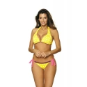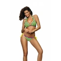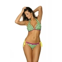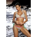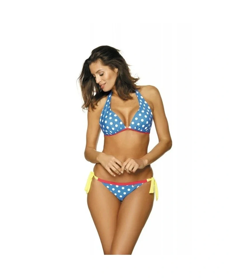Biustonosz modelki jest wiązany na szyi, ma wyprofilowane miseczki i wygodne zapięcie na klips z tyłu. Model posiada pionowe fiszbiny. Wycięte majtki są wiązane po bokach. Strój kąpielowy jest ozdobiony wzorem w kontrastujące kropki.