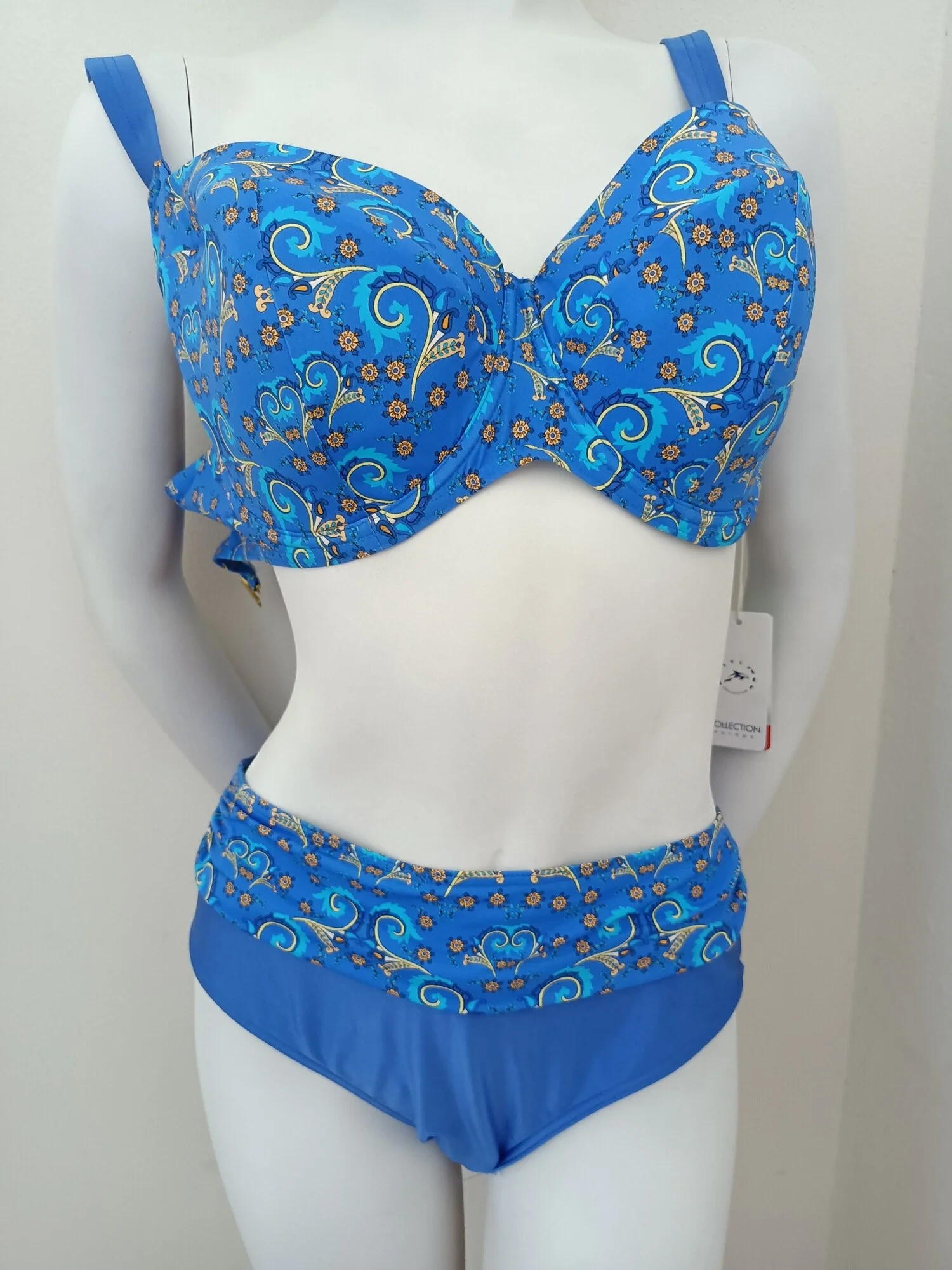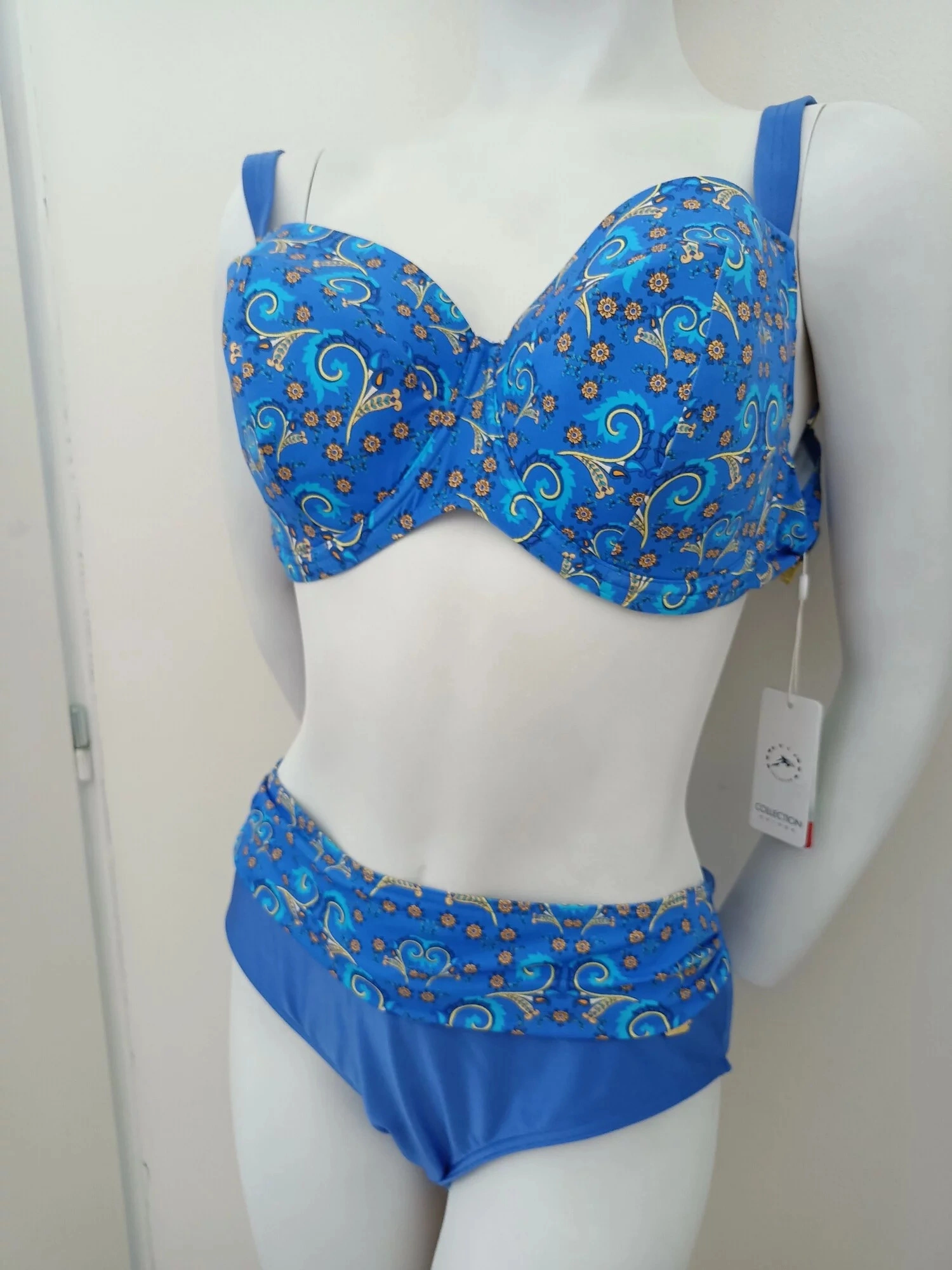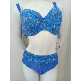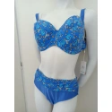 Damski dwuczęściowy kostium kąpielowy w pięknym niebieskim kolorze z aplikacją. Wzmocniony top z fiszbinami. Szorstkie przesuwane ramiączka, zapięcie na biustonosz z tyłu.