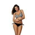 Atrakcyjne, seksowne stroje kąpielowe dla wymagających... Doskonale wyprofilowany biustonosz, który dzięki termicznie uformowanemu koszykowi idealnie dopasowuje się do piersi. Fiszbiny ściśle przylegają i utrzymują piersi na miejscu. Wewnątrz miseczek, we wszystkich rozmiarach, znajduje się niewielka wyściółka, której nie można wyjąć i która pomaga ładnie unieść piersi. Wzór na biustonoszu przypomina małe kokardki. Dzięki klasycznemu ciemnoniebieskiemu kolorowi pięknie wyróżniają się na kremowym tle. Miseczki są również ozdobione dwoma paskami w kolorach kostiumu kąpielowego. Ramiączka są ciemnoniebieskie, regulowane na całej długości. Zapięcie znajduje się z tyłu, na klasyczną klamrę. Dolna część stroju kąpielowego to mini bikini. Bikini jest wąskie i nisko wycięte. Są niebieskie, z podszewką z przodu. Po bokach znajduje się kremowo-niebieski wzorzysty sznurek, który umożliwia regulację obwodu. Ponadto z przodu wyróżnia się złote logo producenta Marko. Seksowny element, w którym będziesz nie do przeoczenia. Będziesz cieszyć się komfortem, jaki zapewniają na plaży i podczas aktywności wodnych.
