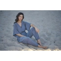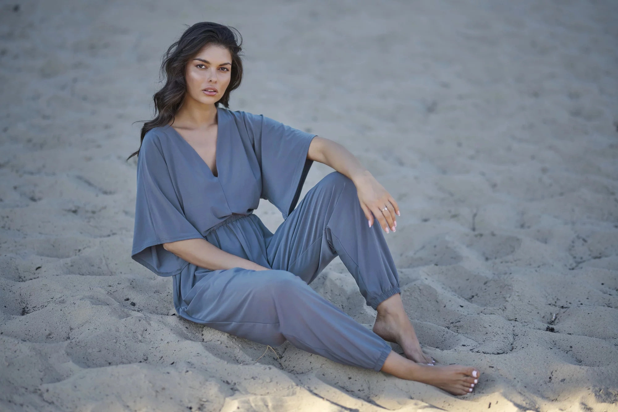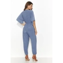 Elegancki kombinezon damski. Luźne rękawy sięgające do zgięcia łokcia zapewniają swobodę ruchów. Kombinezon jest niezwykle zmysłowy dzięki dekoltowi w kształcie litery V, który nie tylko podkreśla biust, ale także optycznie wydłuża szyję. Długie nogawki z praktycznym mankietem dodają kombinezonowi stylu i sprawiają, że świetnie wygląda z różnymi butami.