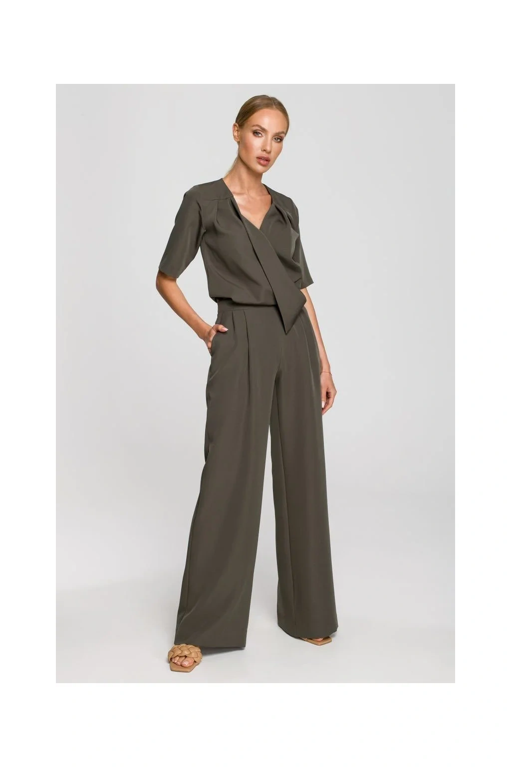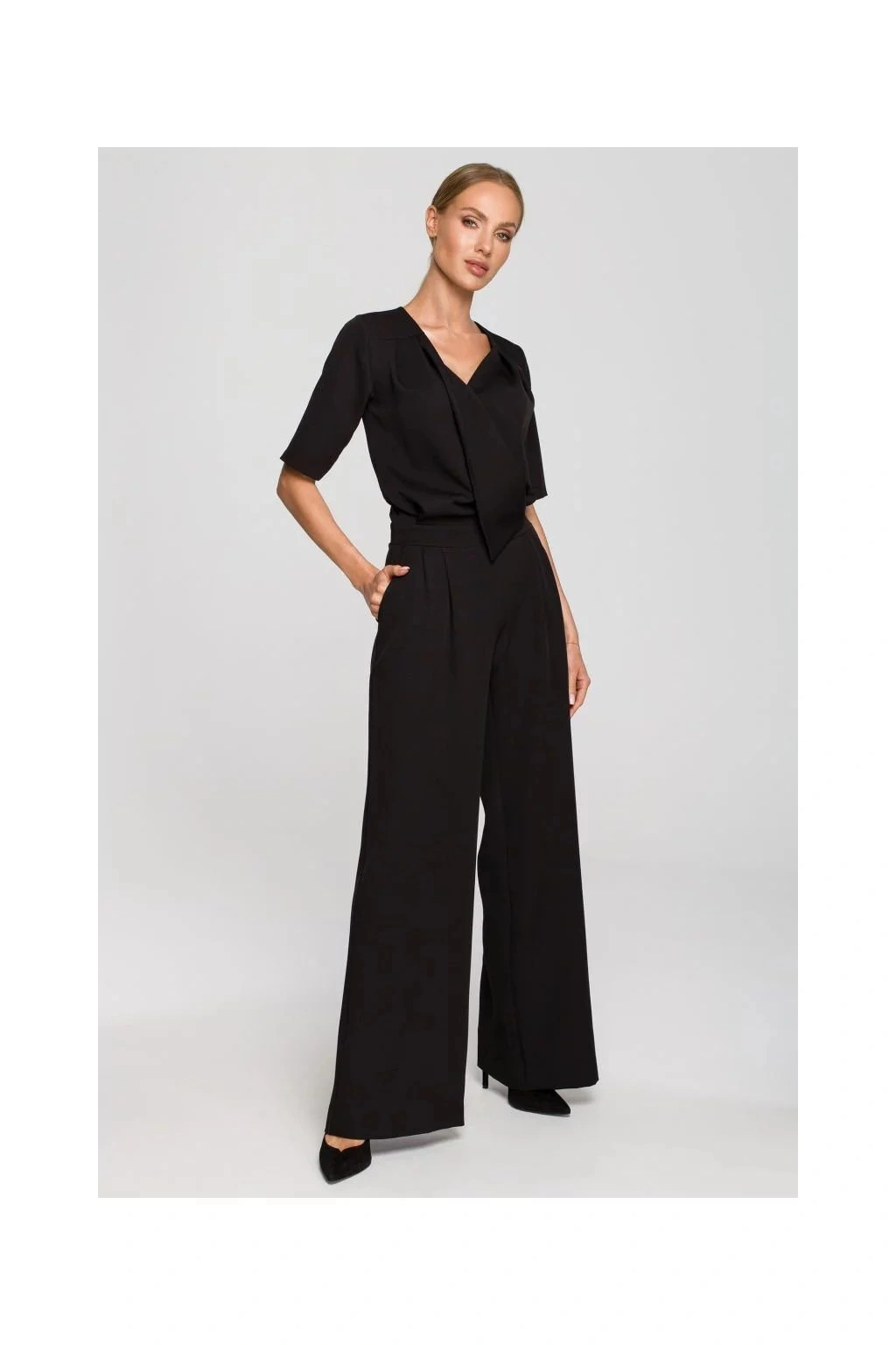 Spodnie garniturowe na specjalne okazje z rękawami do łokcia, kopertową górą, rozcięciami i kieszeniami. Szeroka nogawka. Zapięcie na kryty zamek błyskawiczny.