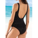 Jednoczęściowy kostium kąpielowy włoskiej marki Siélei. Kostium ma wszyte usztywnienie biustonosza, które w dolnej części jest elastyczne. Ramiączka są mocno wszyte, bez możliwości regulacji długości. Tył ma głębszy dekolt. Przód ma częściową fałdę zwężającą się ku bokowi z okrągłą aplikacją w najwęższym miejscu, dzięki czemu kostium optycznie wyszczupla sylwetkę. Pomagają w tym również złote pionowe paski i pionowe drapowania materiału. Cały kostium jest na podszewce.