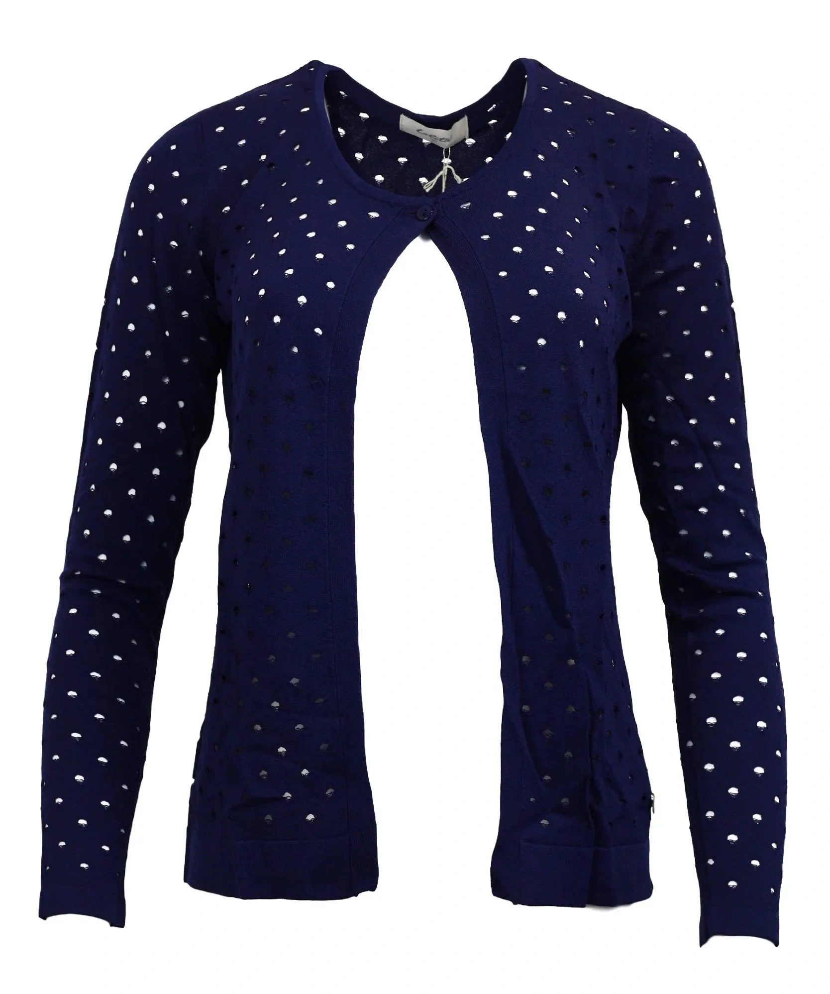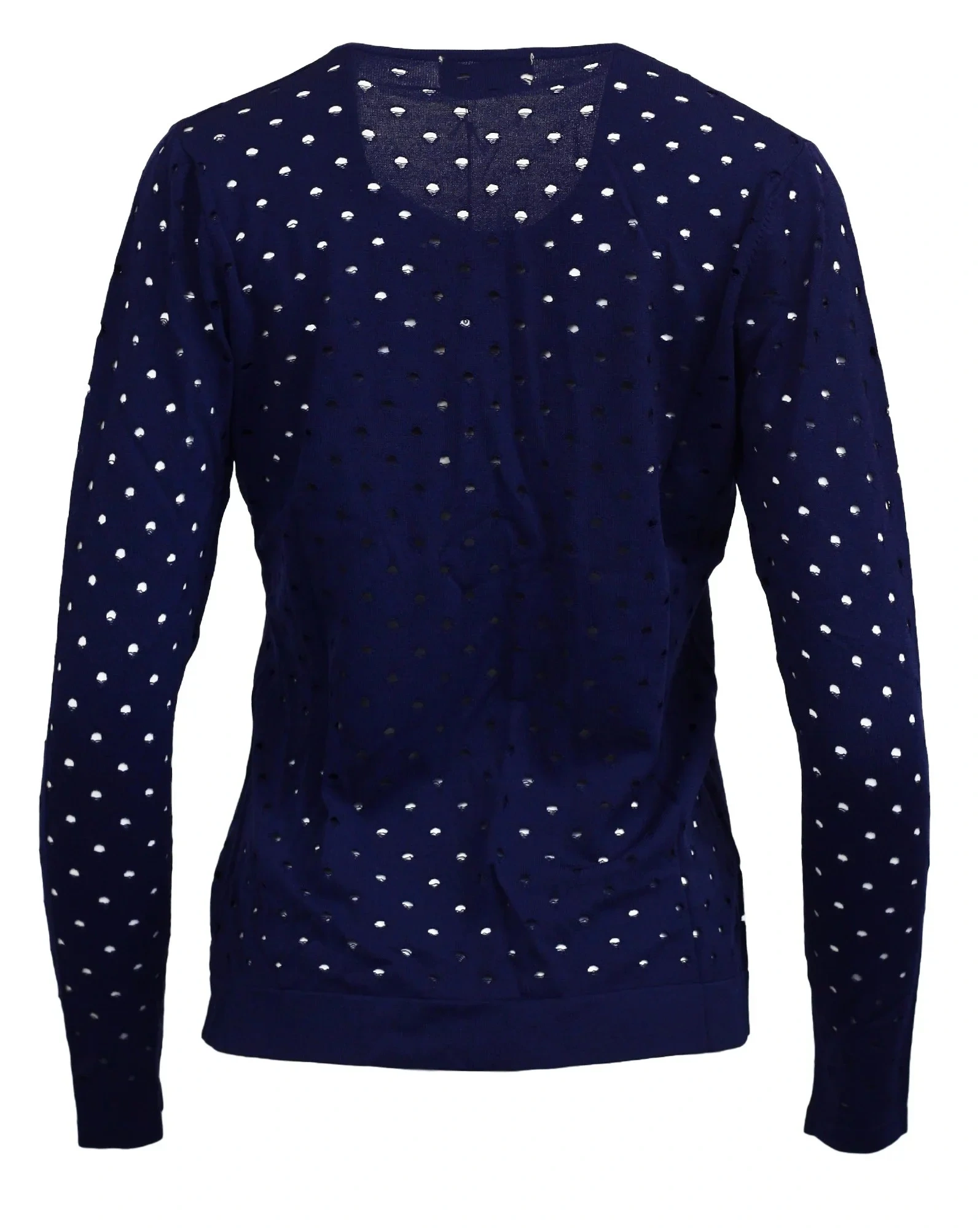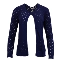elegancka bluzka damska Favab o kroju koszuli, granatowa z białym kołnierzykiem i lamówką wokół ręka