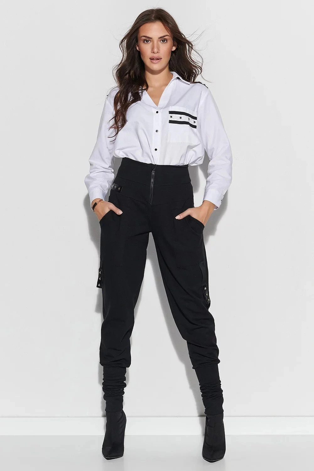 Wysoki stan, zapięcie na guziki, ozdobna klamra w pasie, kieszenie, wykonane z lekkiej elastycznej b