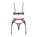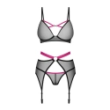 Třídílná souprava z kolekce Novenes elektrizuje a ohromuje svým smyslným designem! Skládá se z podprsenky, tang a podvazkového pásu. Je vyrobena z černé průsvitné látky, zdobené fialovými akcenty a lesklými detaily. Její perfektní střih zaručuje svůdný vzhled a pohodlí při nošení. Přesvědčte se sami, jak mocná může být!