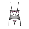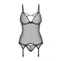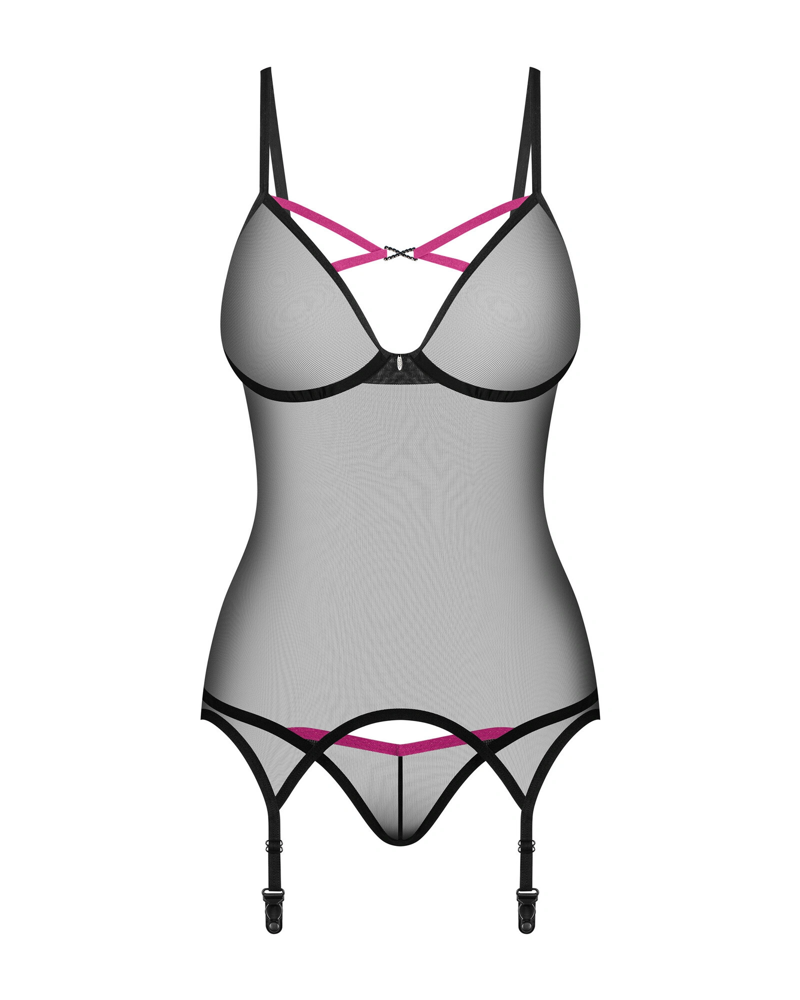 Jemné spodní prádlo, které svádí zajímavými detaily! Černý korzet a tanga z kolekce Novenes jemně obepínají ženské tělo. Díky této extrémně příjemné průsvitné látce, lesklému přívěsku mezi prsy, barevným ramínkům a integrovaným podvazkovým páskům budete po celou noc středem pozornosti.
