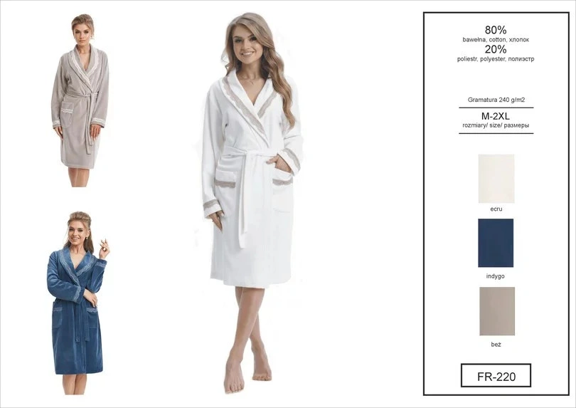 Szlafrok wykonany jestw 100% z satyny poliestrowej. Jest lekki, wygodny na ciele i miękki w dotyku.