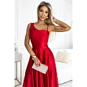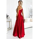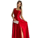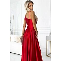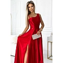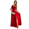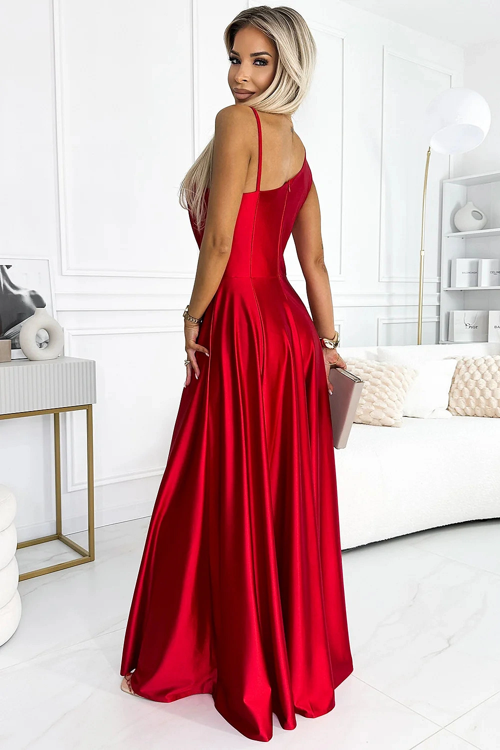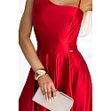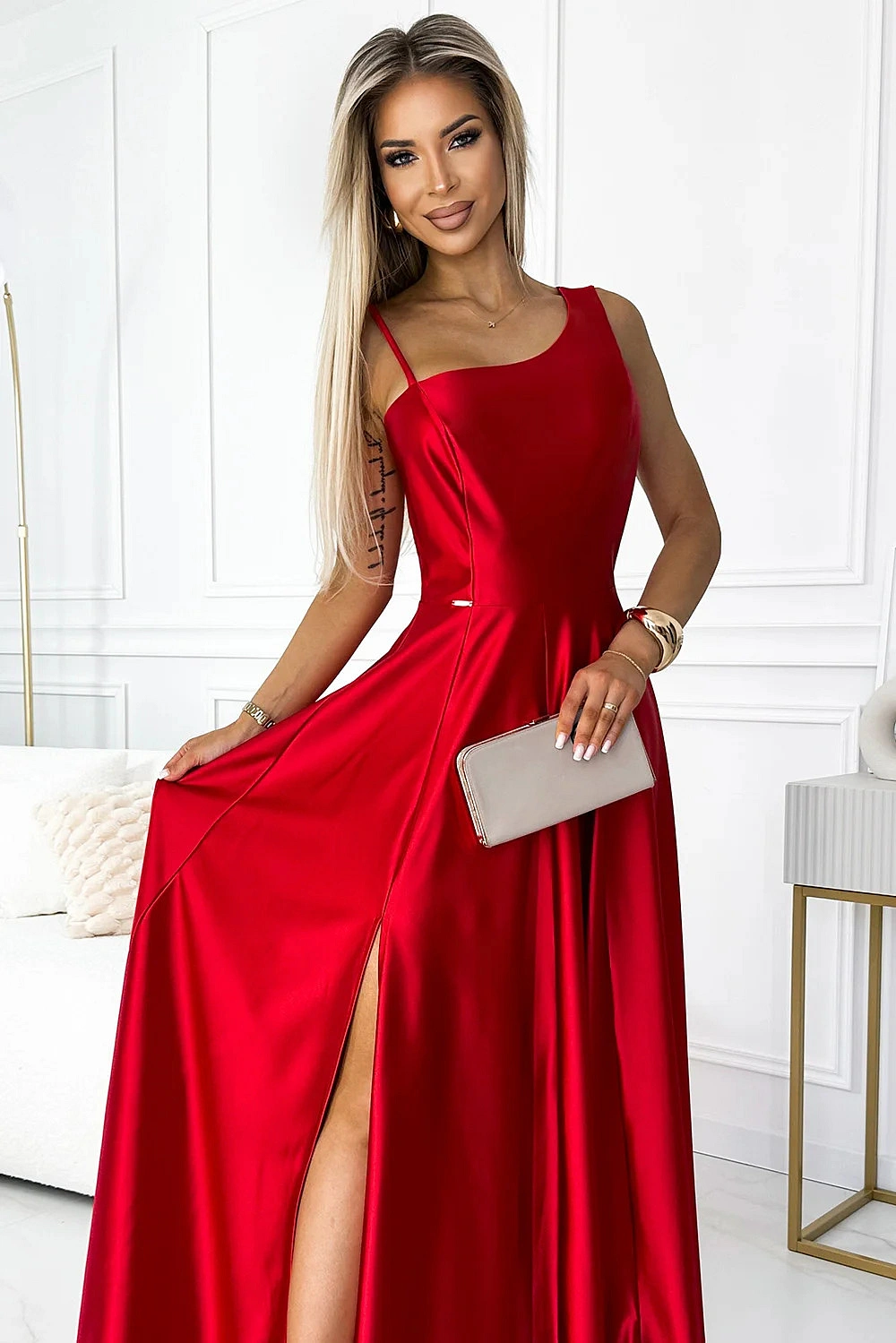 Elegantní maxi dlouhé saténovéšaty na jedno rameno. Vyrobené z lesklého, hladkého, mírně elastického saténu v červené barvě. Šaty se skvěle hodí na svatbu, Silvestra, ples, karneval a další významné události. Polská výroba, značka Numoco.