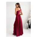 Dlouhé rovné šaty s asymetrickými ramínky, jedno tenké, druhé tlustší. Šaty se odřezávají v pasu, spodek je rozkročený. Šaty se zapínají na skrytý zip po straně. Na zádech ozdobné rozříznutí s pleteným uvazováním.