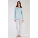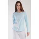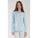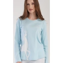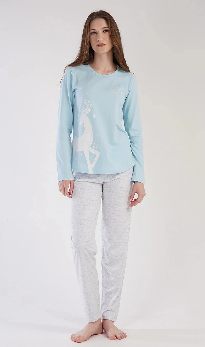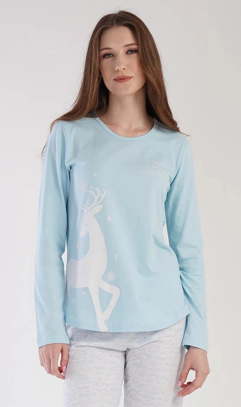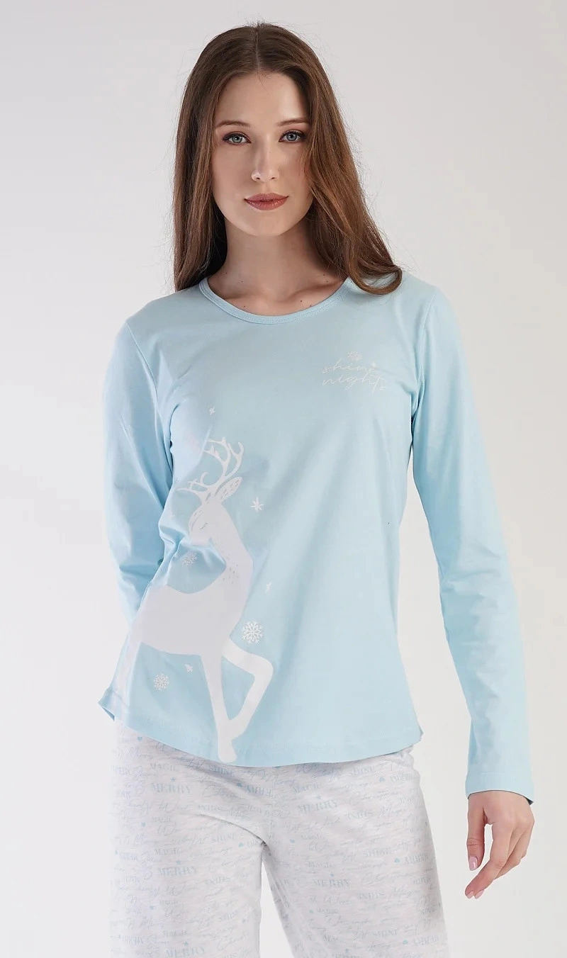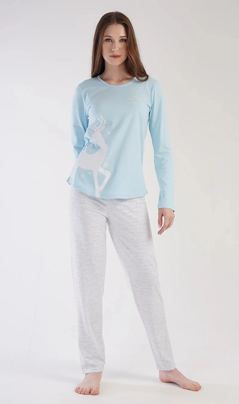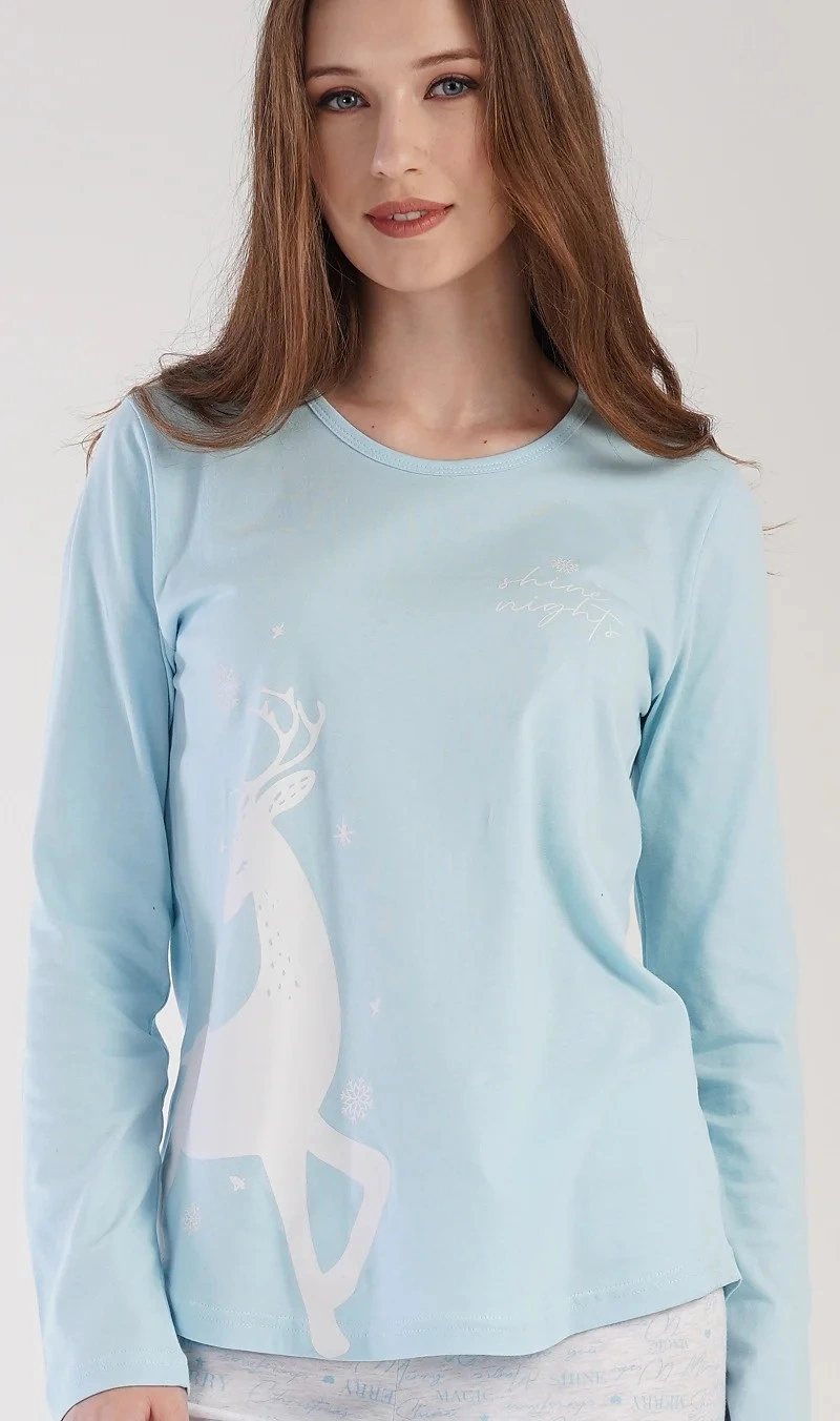 Piżama damska z długim rękawem i długimi spodniami. Piżama składa się z koszulki z długim rękawem i długich spodni. Koszulka jest jednokolorowa, ozdobiona białym jeleniem i subtelnym napisem SHINE NIGHTS. Spodnie są jasnoszare, zadrukowane niebieskimi napisami. Spodnie mają elastyczny pas i sznurek do ściągania. Zastosowany materiał jest elastyczny i przyjemny w dotyku. Koszulka składa się w 100% z bawełny, spodnie mają zawartość bawełny 70%.