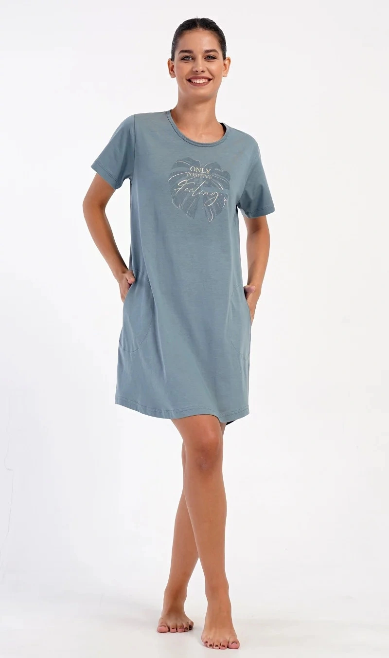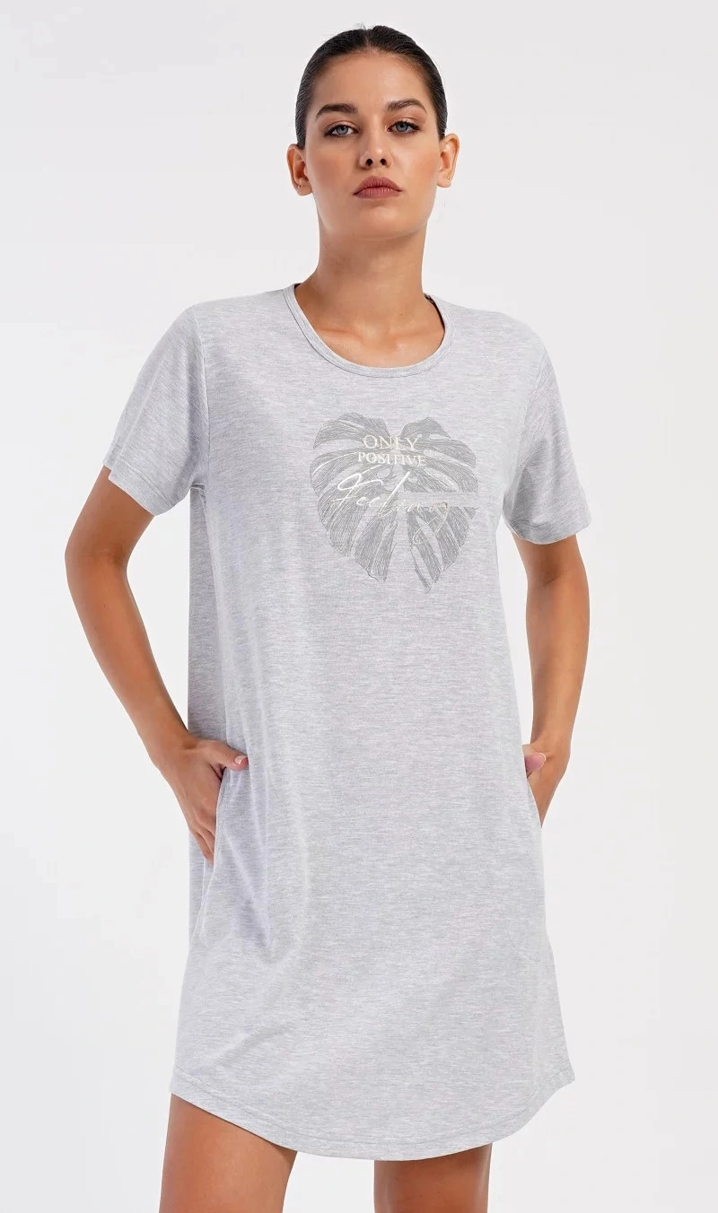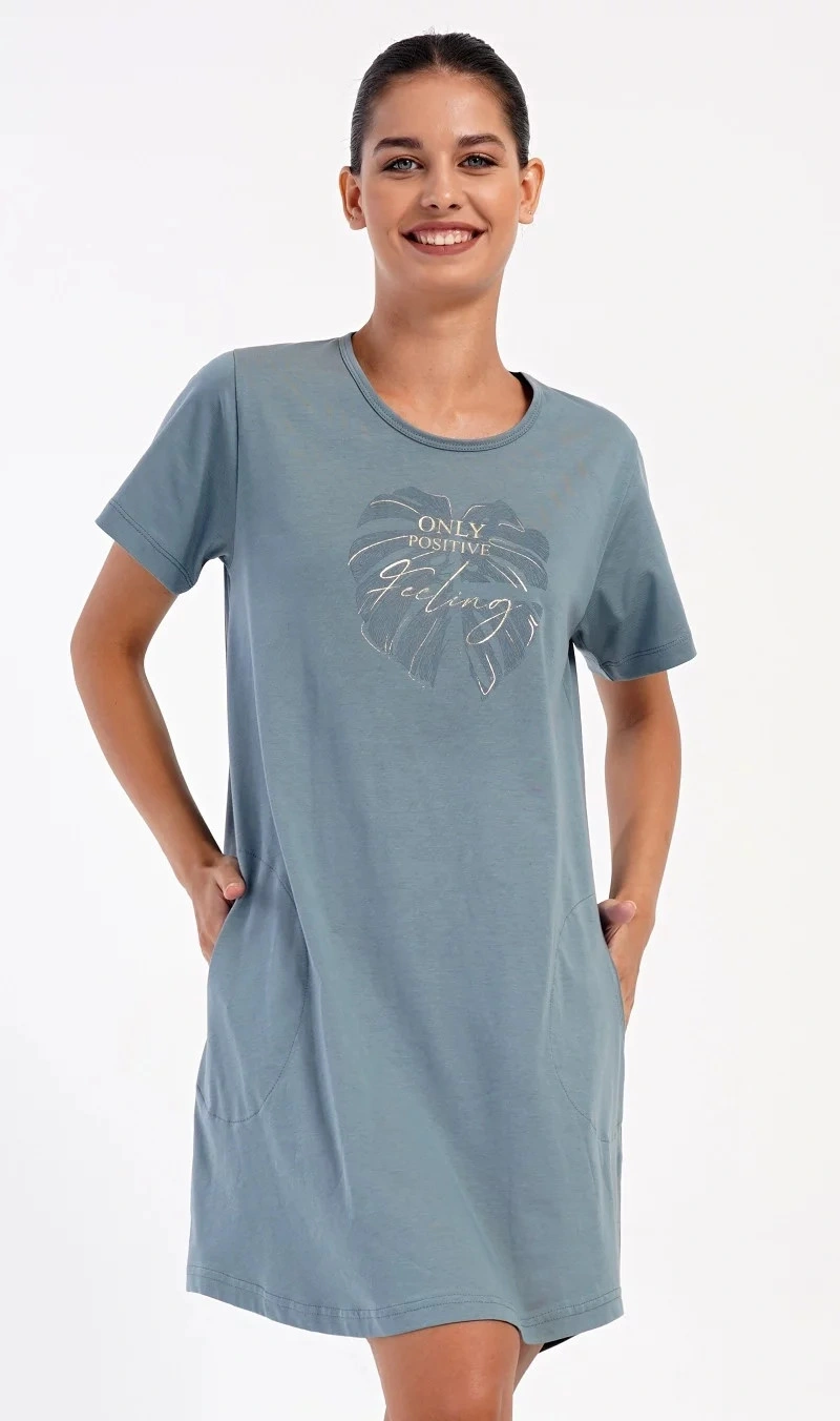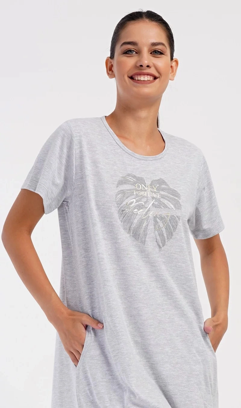 Damska sukienka domowa Elizabeth z krótkim rękawem. Sukienka domowa w jednolitym kolorze z okrągłym dekoltem i kieszeniami jest ozdobiona rysunkiem dużego liścia i napisem "Only positive feeling". Zastosowany materiał bawełniany jest przyjemny i elastyczny w dotyku. Sukienka jest wygodna i może być używana do prawie wszystkich czynności rekreacyjnych. Nadaje się do spania i do noszenia w ciągu dnia. Zawartość bawełny w kolorze ciemnoszarym wynosi 100%, a w kolorze jasnoszarym 70%.