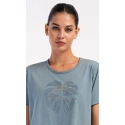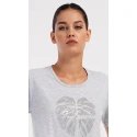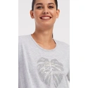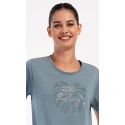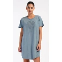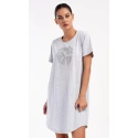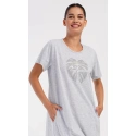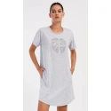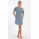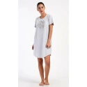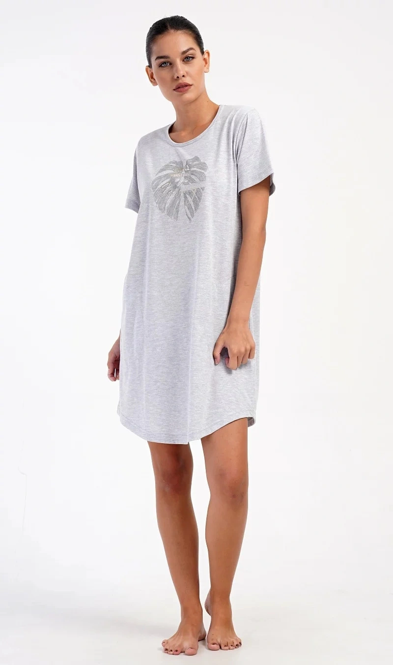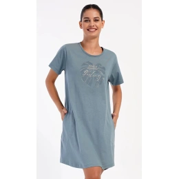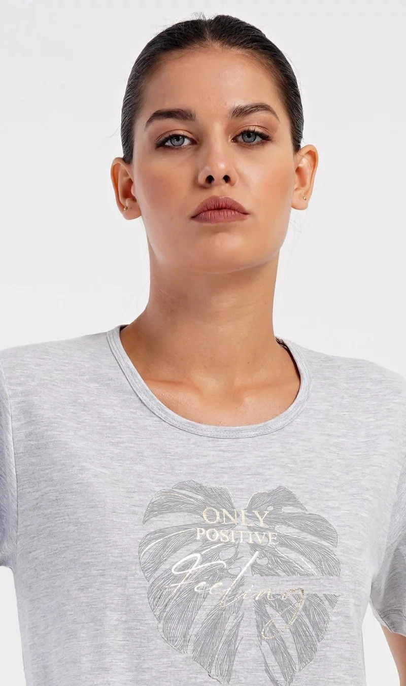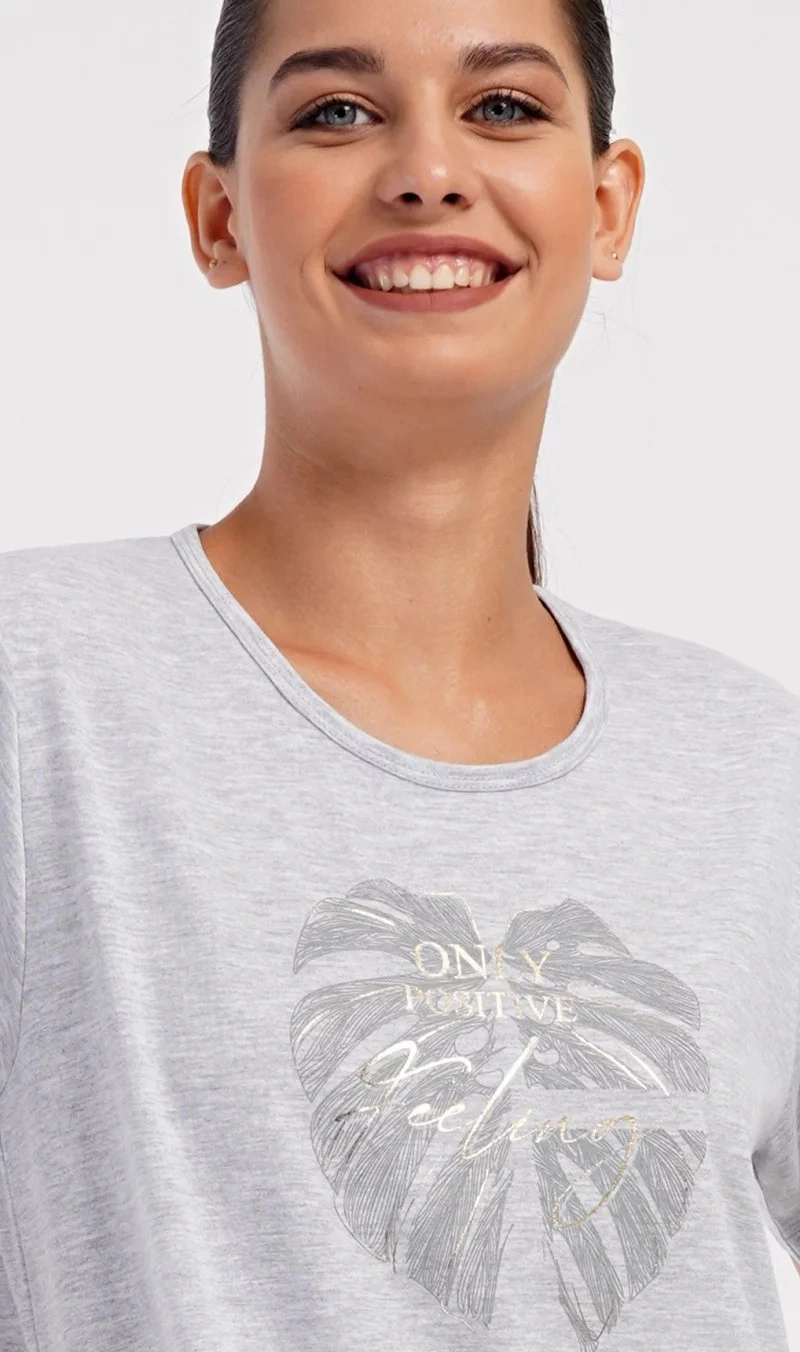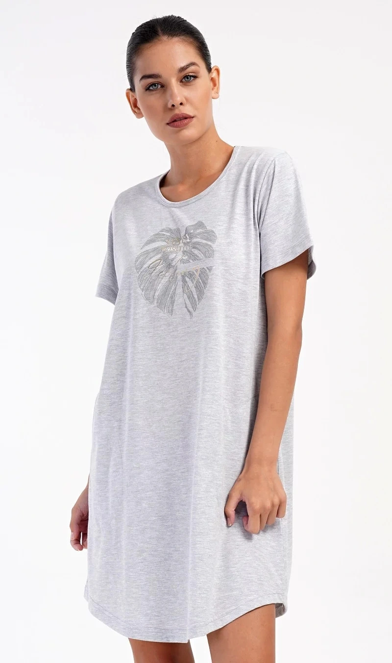 Damska sukienka domowa Elizabeth z krótkim rękawem. Sukienka domowa w jednolitym kolorze z okrągłym dekoltem i kieszeniami jest ozdobiona rysunkiem dużego liścia i napisem "Only positive feeling". Zastosowany materiał bawełniany jest przyjemny i elastyczny w dotyku. Sukienka jest wygodna i może być używana do prawie wszystkich czynności rekreacyjnych. Nadaje się do spania i do noszenia w ciągu dnia. Zawartość bawełny w kolorze ciemnoszarym wynosi 100%, a w kolorze jasnoszarym 70%.