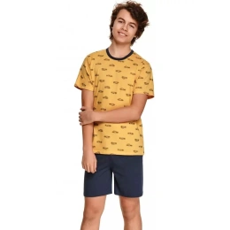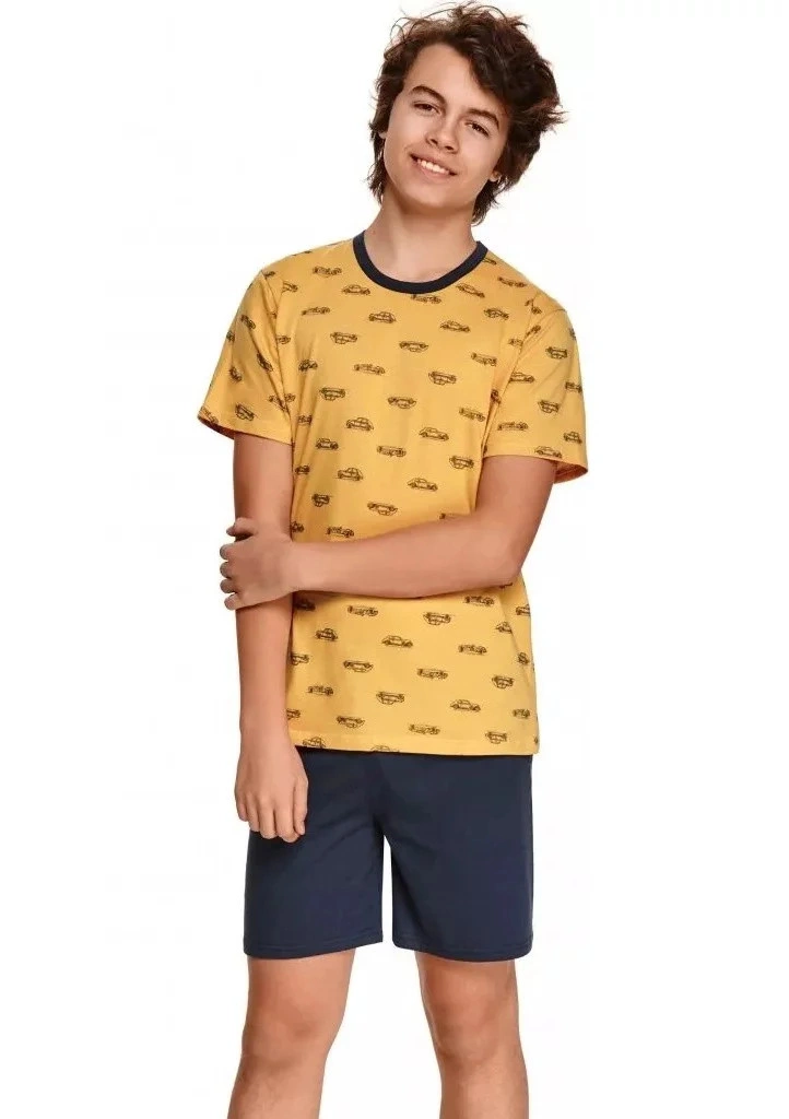Piżama chłopięca Taro z krótkim rękawem i spodenkami. Piżama ma krótkie rękawy, okrągły dekolt i nadruk samochodu. Szorty są monochromatyczne i idealnie pasują do topu.