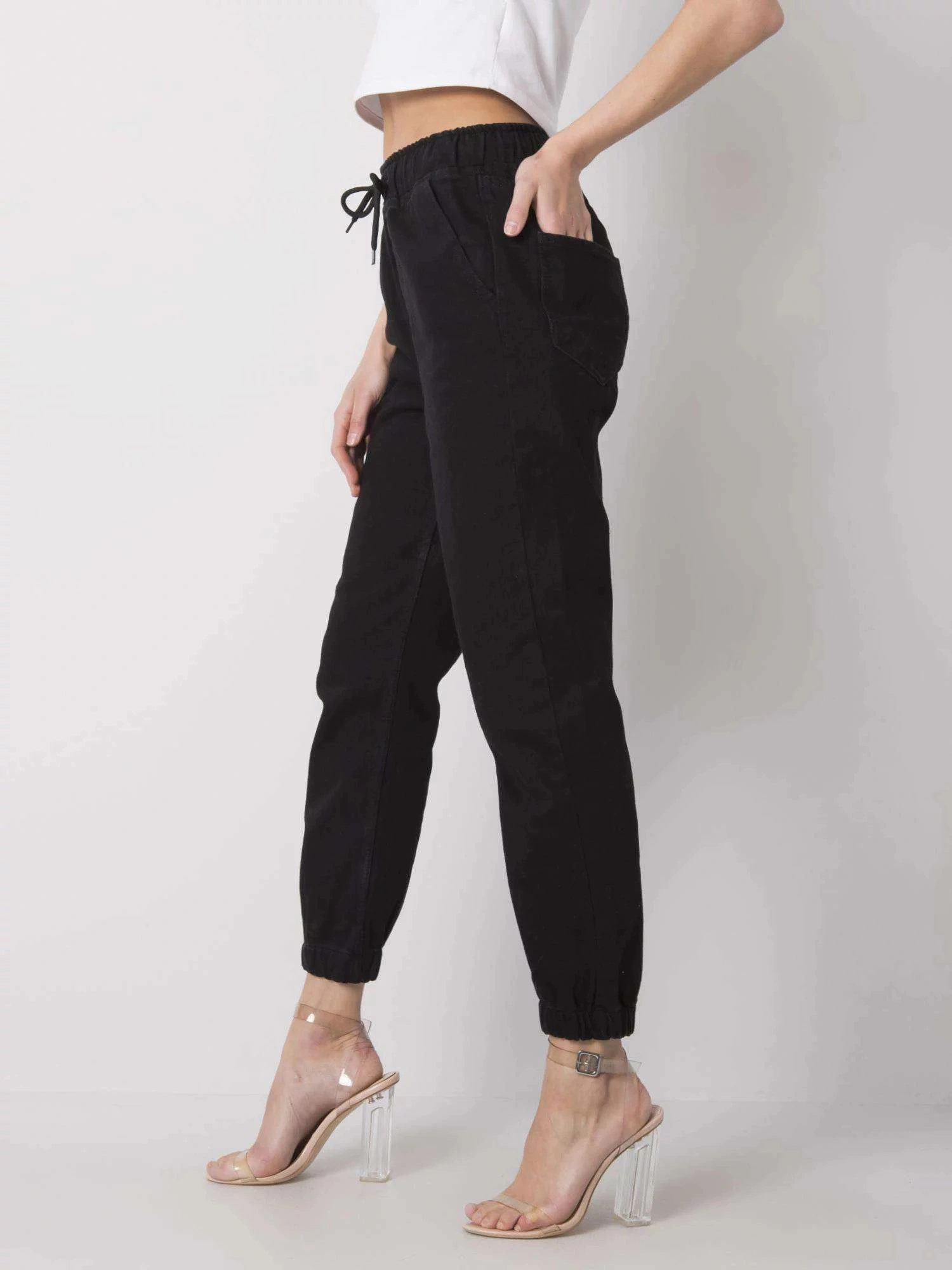 Modelka ma na sobie rozmiar 27. Wymiary modelki: wzrost 174 cm, biust 86 cm, talia 60 cm, biodra 86 cm.